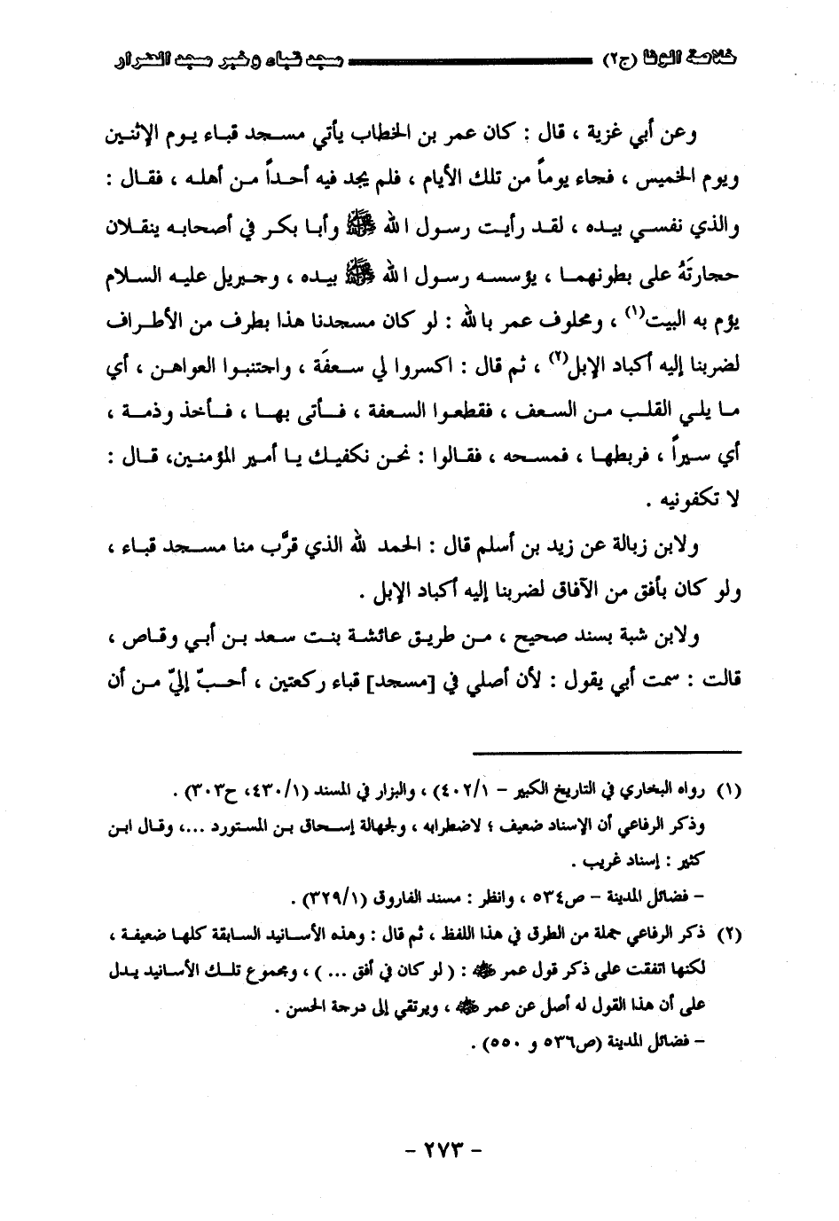 وعن أبي غزية قال كان عمر بن الخطاب يأتي مسجد قباء يوم الاثنين ويوم الخميس فجاء يوما من تلك الأيام فلم يجد فيه أحدا من أهله فقال والذي نفسي بيده لقد رأيت رسول الله صلى الله عليه وسلم وأبا بكر في أصحابه ينقلان حجارته على بطونهما يؤسسه رسول الله صلى الله عليه وسلم بيده وجبريل عليه السلام يأم به البيت ومحلوف عمر بالله لو كان مسجدنا هذا بطرف من الأطراف لضربنا إليه أكباد الأبل ثم قال اكسروا لي سعفة واجتنبوا العواهن أي ما يلي القلب من السعف فقطعوا السعفة فأتى بها فأخذوا ذمة أي سيرا فربطها فمسحه فقالوا نحن نكفيك يا أمير المؤمنين قال لا تكفونيه ولأبن زبالة عن زيد بن أسلم قال الحمد لله الذي قرب منا مسجد قباء ولو كان في أفق من الأفاق لضربنا إليه أكباد الإبل ولأبن شبة بسند صحيح من طريق عائشة بنت سعد بن أبي وقلص قالت سمعت أبي يقول لأن أوصلي في مسجد قباء ركعتين أحب إلي من أن