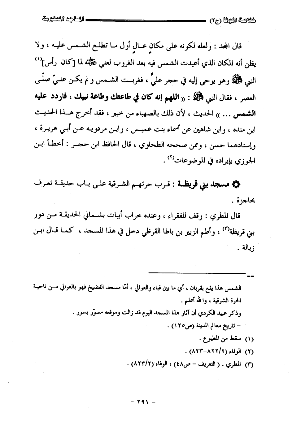 قال المجد ولعله لكونه على مكان عال أول ما تطلع الشمس عليه ولا يظن إنه المكان الذي أعيدت الشمس فيه بعد الغروب لعلي رضي الله عنه لما كان رأس النبي صلى الله عليه وسلم وهو يوحى إليه في حجر عليّ فغربت الشمس ولم يكن عليّ صلى العصر فقال النبي صلى الله عليه وسلم اللهم إنه كان في طاعتك وطاعة نبيك فردد عليه الشمس الحديث لأن ذلك بالصهباء من خيبر فقد أخرج هذا الحديث أبن مندة وأبن شاهين عن أسماء بنت عميس وأبن مردوية عن أبي هريرة وإسنادهما حسن ومما صححه الطحاوي قال الحافظ أبن حجر أخطأ أبن الجوزي بإيراده في الموضوعات " مسجد بني قريظة " قرب حرتهم الشرقية على باب حديقة تعرف بجاجزة قال المطري وقف للفقراء وعنده خراب أبيات بشمالي الحديقة من دور بني قريظة وأطم الزبير بن باطا القرظي دخل في هذا المسجد كما قال أبن زبالة