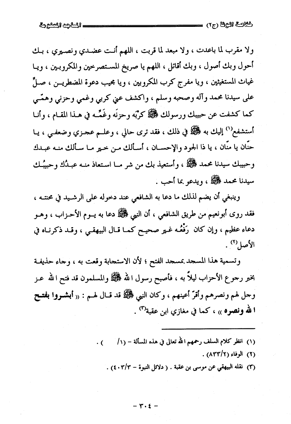 ولا مقرب لما باعدت ولا مبعد لما قربت اللهمّ أنت عضدي ونصيري بك أحول وبك أصول وبك أقاتل اللهمّ يا صريخ المستصرخين والمكروبين ويا غياث المستغيثين ويا مفرج كرب المكروبين ويا مجيب دعوة المضطرين صل على سيدنا محمد وآله وصحبه وسلم واكشف عني كربي وغمي وحزني وهمي كما كشفت عن حبيبك ورسولك صلى الله عليه وسلم كربه وحزنه وغمه في هذا المقام وأنا استشفع إليك به صلى الله عليه وسلم في ذلك فقد ترى حالي وتعلم عجزي وضعفي يا حنان يا منان يا ذا الجود والإحسان أسألك من خير ما سألك منه عبدك وحبيبك سيدنا محمد صلى الله عليه وسلم وأستعيذ بك من شر ما استعاذ منه عبدك وحبيبك سيدنا محمد صلى الله عليه وسلم ويدعو بما أحب وينبغي أن يضم لذلك ما دعا به الشافعيّ عند دخوله على الرشيد في محنته فقد روى أبو نعيم من طريق الشافعي إن النبي صلى الله عليه وسلم دعا به يوم الأحزاب وهو دعاء عظيم وإن كان رفعه غير صحيح كما قال البيهقيّ وقد ذكرناه في الأصل وتسمية هذا المسجد بمسجد الفتح لأن الاستجابة وقعت به وجاء حذيفة بخبر رجوع الأحزاب ليلا به فأصبح رسول الله صلى الله عليه وسلم والمسلمون قد فتح الله عز وجل لهم
