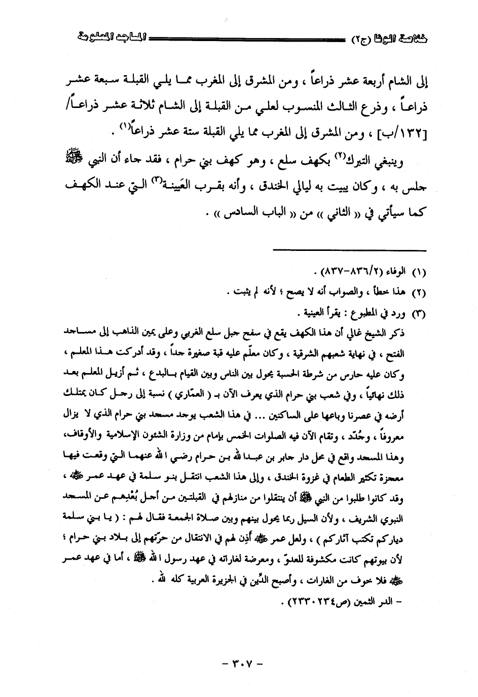 إلى الشام أربعة عشر ذراعا ومن المشرق إلى المغرب مما يلي القبلة سبعة عشر ذراعا وذرع الثالث المنسوب لعلي من القبلة إلى الشام ثلاثة عشر ذراعا ومن المشرق إلى المغرب مما يلي القبلة ستة عشر ذراعا وينبغي التبرك بكهف سلع وهو كهف بني حرام فقد جاء أن النبي صلى الله عليه وسلم جلس به وكان بيت به ليالي الخندق وأنه يقرأ العينية التي عند الكهف كما سيأتي في الثاني من الباب السادس