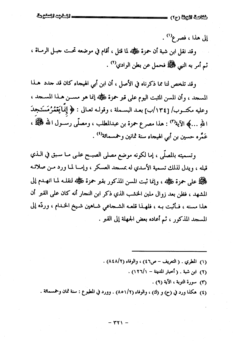 إلى هذا فصرع وقد نقل ابن شبة أن حمزة رضي الله عنه لما قتل أقام في موضعه تحت جبل الرماة ثم أمر به النبي صلى الله عليه وسلم فحمل على بطن الوادي وقد تلحن لنا مما ذكرناه في الأصل أن ابن أبي الهيجاء كان قد جدد هذا المسجد وأن المسنّ المثبت اليوم على قبر حمزة رضي الله عنه إنما هو مسن هذا المسجد وعليه مكتوب بعد البسملة وقوله تعالى إنما يعمر مساجد الله الآية هذا مصرع حمزة بن عبد المطلب ومصلى رسول الله صلى الله عليه وسلم عمره حسين بن أبي الهيجاء سنة ثمان وخمسمائة وتسميته بالمصلى أما لكونه موضع مصلى الصبح على ما سبق في الذي قبله ويدل لذلك تسمية الأسدي له بمسجد العسكر وأما لما ورد من صلاته صلى الله عليه وسلم على حمزة رضي الله عنه وإنما ثبت المسنّ المذكور بقبر حمزة رضي الله عنه لنقله لما انهدم إلى المشهد فظن بعد زوال ملبن الخشب الذي ذكر ابن النجار أنه كان على القبران هذا مسنة فأثبت به فلهذا قلعه الشجاعي شاهين الجمالي شيخ الخدام ورده إلى المسجد المذكور ثم أعاد بعض الجهلة إلى القبر.