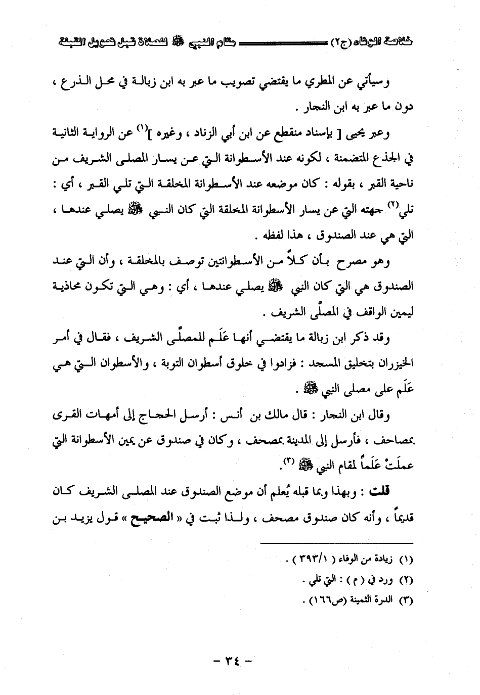 وسيأتي عن المطري ما يقتضي تصويب ما عبر به ابن زبالة في محل الجذع دون ما عبر به ابن النجار وعبر يحيي عن الرواية الثانية في الجذع المتضمنة لكونه عند الأسطوانة التي عن يسار المصلى الشريف من ناحية القبر يقول كان موضعه عند الأسطوانة المخلقة التي تلي القبر أي تلي جهته التي عن يسار الأسطوانة المخلقة التي كان النبي صلى الله عليه وسلم عندها التي هي الصندوق هذه الفظة وهو مصرح بأن كلا من الأسطوانتين يوصف بالمخلقة وأن التي عند الصندوق هي التي كان النبي صلى الله عليه وسلم يصلي عندها أي وهي التي تكون محاذية ليمين الواقف في المصلى الشريف وقد ذكر ابن زبالة ما يقتضي أنها علم للمصلى الشريف فقال في أمر الخيزران بتخليق المسجد فزادوا في خلوق أسطوانة التوبة والأسطوانة التي هي على مصلى النبي صلى الله عليه وسلم وقال ابن النجار قال مالك بن أنس أرسل الحجاج إلى أمهات القرى بمصاحف فأرسل إلى المدينة بمصحف وكان في صندوق عن يمين الأسطوانة التي عملت علما لمقام النبي صلى الله عليه وسلم قلت وبهذا وبما قبله يعلم أن وضع الصندوق عند المصلى الشريف كان قديما وأنه كان صندوق مصحف ولذا ثابت في الصحيح قول يزيد بن