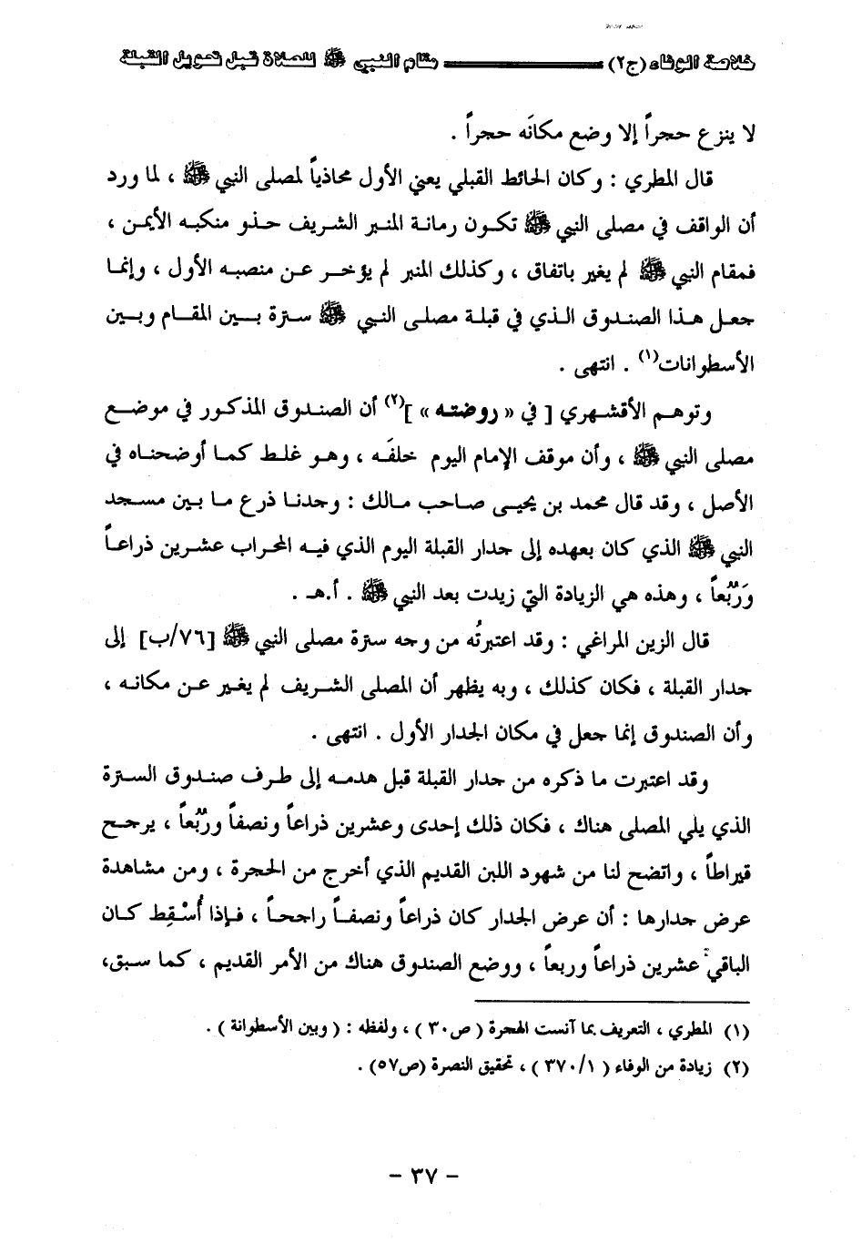 لا ينزع حجر إلا وضع مكانه حجرا قال المطري وكان الحائط القبلي يعني الأول محاذيا لمصلى النبي صلى الله عليه وسلم لما ورد أن الواقف في مصلى النبي صلى الله عليه وسلم تكون رمانة المنبر الشريف حذو منكبه الأيمن فقام النبي صلى الله عليه وسلم لم يغير بالاتفاق وكذلك المنبر لم يؤخر عن منصبه الأول وإنما جعل هذا الصندوق الذي قبلة مصلى النبي صلى الله عليه وسلم سترة بين المقام وبين الأسطوانات انتهى وتوهم الأقشهريّ أن الصندوق المذكور في موضع مصلى النبي صلى الله عليه وسلم وأن موقف الإمام اليوم خلفه وهو غلط كما أوضحناه في الأصل وقد قال محمد بن يحيي صاحب مالك وجدنا ذرع ما بين مسجد النبي صلى الله عليه وسلم الذي كان بعهده إلى جدار القبلة اليوم الذي فيه المحراب عشرين ذراعا وربعا وهذه هي الزيادة التي زيدت بعد النبي صلى الله عليه وسلم اه قال الزين المراغي وقد اعتبرته من وجه مصلى النبي صلى الله عليه وسلم إلى جدار القبلة فكان كذلك وبه يظهر أن المصلى الشريف لم يغير عن مكانه وأن الصندوق إنما جعل في مكان الجدار الأول انتهى وقد اعتبرت ما ذكره من جدار القبلة قبل هدمه إلى طرف صندوق السترة الذي يلي المصلى هناك فكان ذلك إحدى وعشرين ذراعا ونصفا وربعا يرجح قيراطا وأتضح لنا من شهود اللبن القديم الذي أخرج من الحجرة ومن مشاهدة عرض جدارها أن عرض الجدار كان ذراعا ونصفا راجحا فإذا أسقط كان الباقي عشرين ذراعا وربعا ووضع الصندوق هناك من الأمر القديم كما سبق