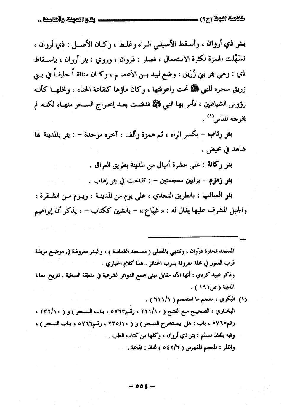 بئر ذي أروان وأسقط الأصيلي الراء وغلط وكان الأصل ذي أروان فسهلت الهمزة لكثرة الاستعمال فصار ذروان وروى بئر أروان بإسقاط ذي وهي بئر بني زريق وضع لبيد بن الأعصم وكان منافقا حليفا في بني زريق سحره النبي صلى الله عليه وسلم تحت راعوفتها وكان ماؤها كنقاعة الحناء ونخلها كأنه رؤوس الشياطين فأمر النبي صلى الله عليه وسلم فدفنت بعد إخراج السحر منها لكنه لم يخرجه للناس " بئر رئاب " بكسر الراء ثن همزة وألف آخر موحدة بئر بالمدينة لها شاهد في محيص " بئر ركانة " على عشرة أميال من المدينة بطريق العراق " بئر زمزم " بزايين معجمتين تقدمت في بئر أهاب " بئر السائب " بالطريق النجدي على يوم من المدينة ويوم من الشقرة والجبل المشرق عليها يقال له شباع بالشين ككاب يذكر أن إبراهيم