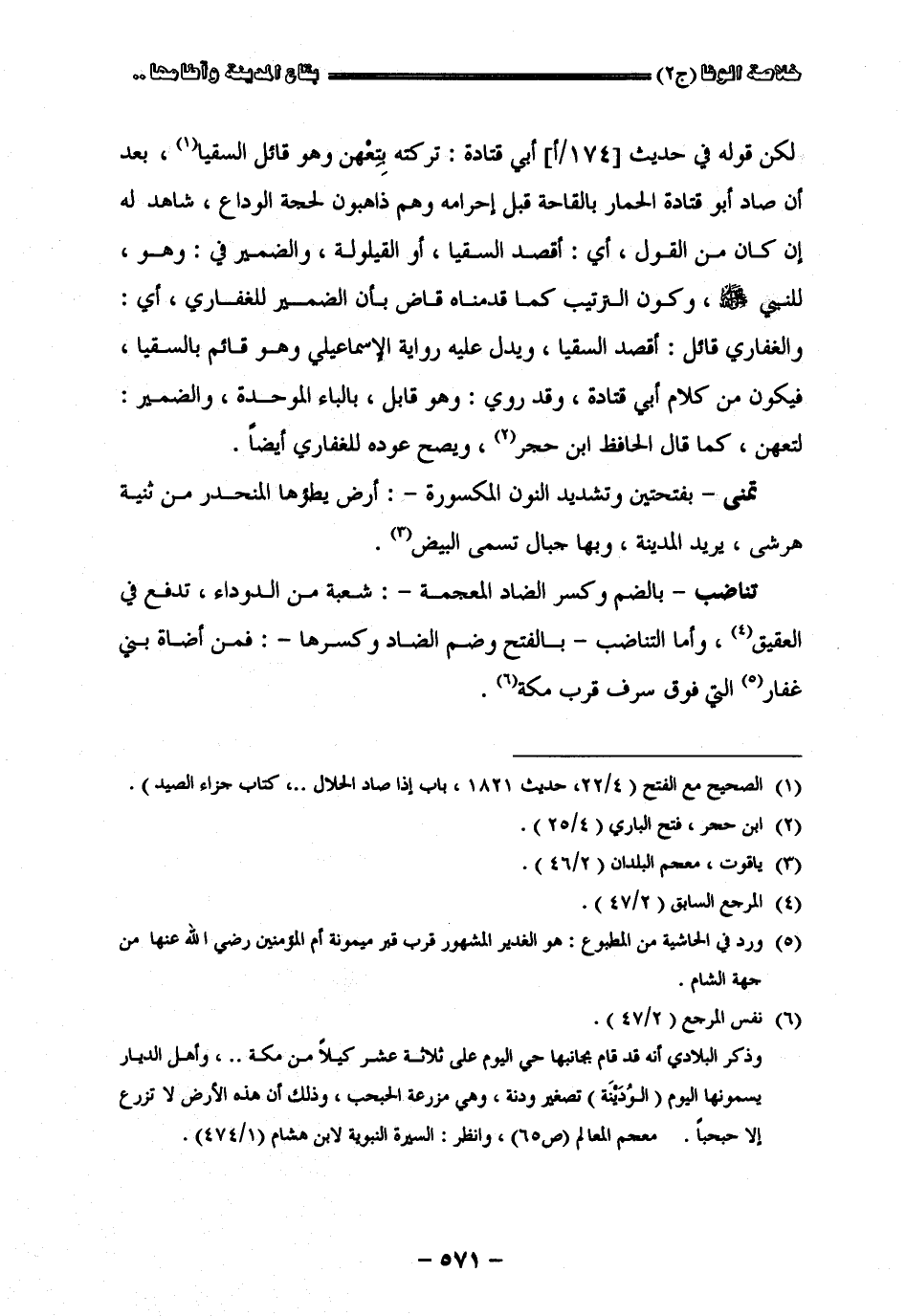 لكن قوله في حديث أبي قتادة تركته بعهن وهو قائل السقيا بعد أن صاد أبو قتادة الحمار بالقاحة قبل إحرامه وهم ذاهبون لحجة الوداع شاهد له أن كان من القول أي أقصد السقيا أو القيلولة والضمير في وهو للنبي صلى الله عليه وسلم وكون الترتيب كما قدمناه قاض بأن الضمير للغفاري أي والغفاري قائل أقصد السقيا ويدل عليه رواية الإسماعيلي وهو قائم بالسقيا فيكون من كلام أبي قتادة وقد روى وهو قابل بالباء الموحدة والضمير لتعهن كما قال الحافظ أبن حجر ويصح عوده للغفاري أيضا " تمنى " بفتحتين وتشديد النون المكسورة أرض يطؤها المنحدر من ثنية هرشي يريد المدينة وبها جبال تسمى البيض " تناضب " بلضم وكسر الضاد المعجمة شعبة من الدوداء تدفع في العقيق وأما التناصب بالفتح وضم الضاد وكسرها فمن أضاة بني غفار التي فوق سرف قرب مكة