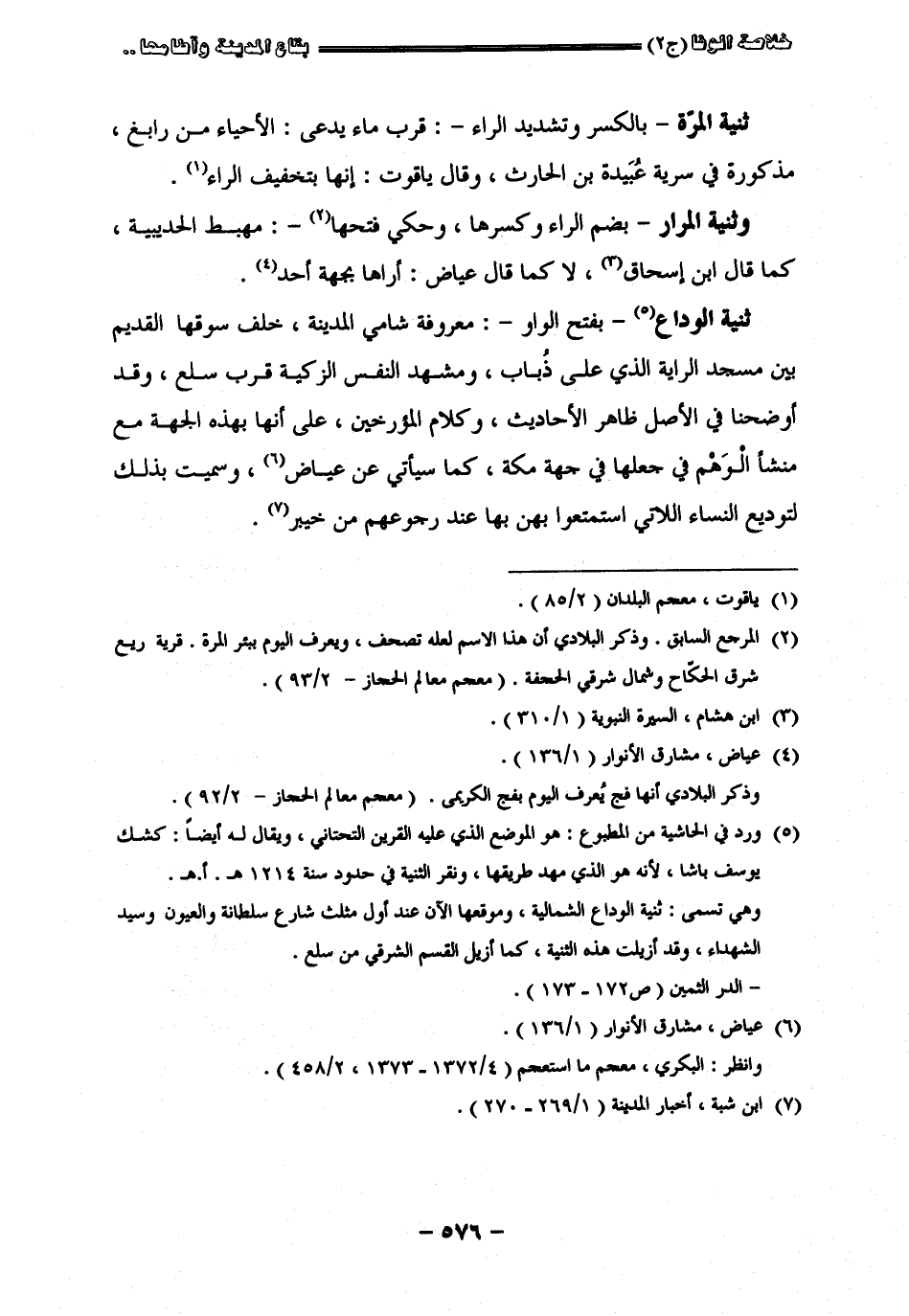 ثنية " المرة بالكسر وتشديد الراء قرب ماء يدعى الأحياء من رابغ مذكورة في سرية عبيدة بن الحرث وقال ياقوت أنها بتخفيف الراء " وثنية " المرار بضم الميم وكسرها وحكى فتحها مهبط الحديبية كما قال أبن إسحاق لا كما قال عياض أراها بجهة أحد " ثنية " الوداع بفتح معروفة شامي المدينة خلف سوقها القديم بين مسجد الراية الذي على ذباب ومشهد النفس الزكية قرب سلع وقد أوضحنا في الأصل ظاهر الأحاديث وكلام المؤرخين على أنها بهذه الجهة مع منشأ الوهم في جعلها في جهة مكة كما سيأتي عن عياض وسميت بذلك لتوديع النساء اللاتي استمتعوا بهن عند رجوعهم من خيبر