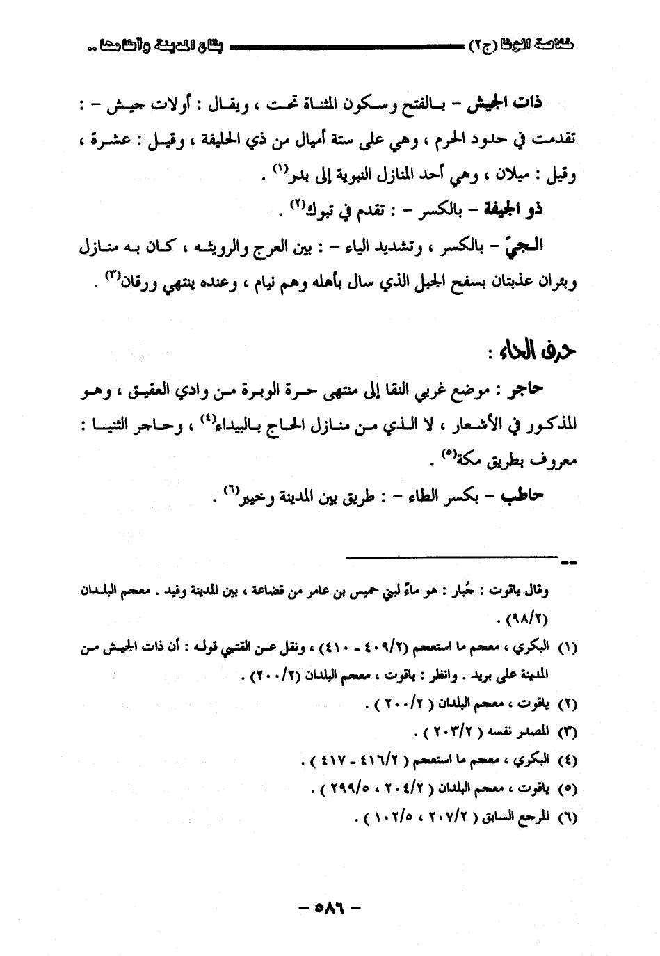 " ذات الجيش " بالفتح وسكون المثناة تحت ويقال أولات الجيش تقدّمت في حدود الحرم وهي على ستة أميال من ذي الحليفة وقيل عشرة وقيل ميلان وهي أحد المنازل النبوية إلى بدر " ذو الجيفة " بالكسر تقدّم في تبوك " الجيّ " بالكسر وتشديد الياء بين العرج والرويثة كان به منازل وبئران عذبتان بسفح الجبل الذي سال بأهله وهم نيام وعنده ينتهي ورقان. الفتح وتشديد الواو وكسر النون وياء مشدّدة وحكى تخفيفها موضع شاميّ المدينة بينها وبين أحد بطرف الحرة الشرقية وأخطأ من قال بجهة الفرع " الجيار " ككتاب من أرض خيبر "