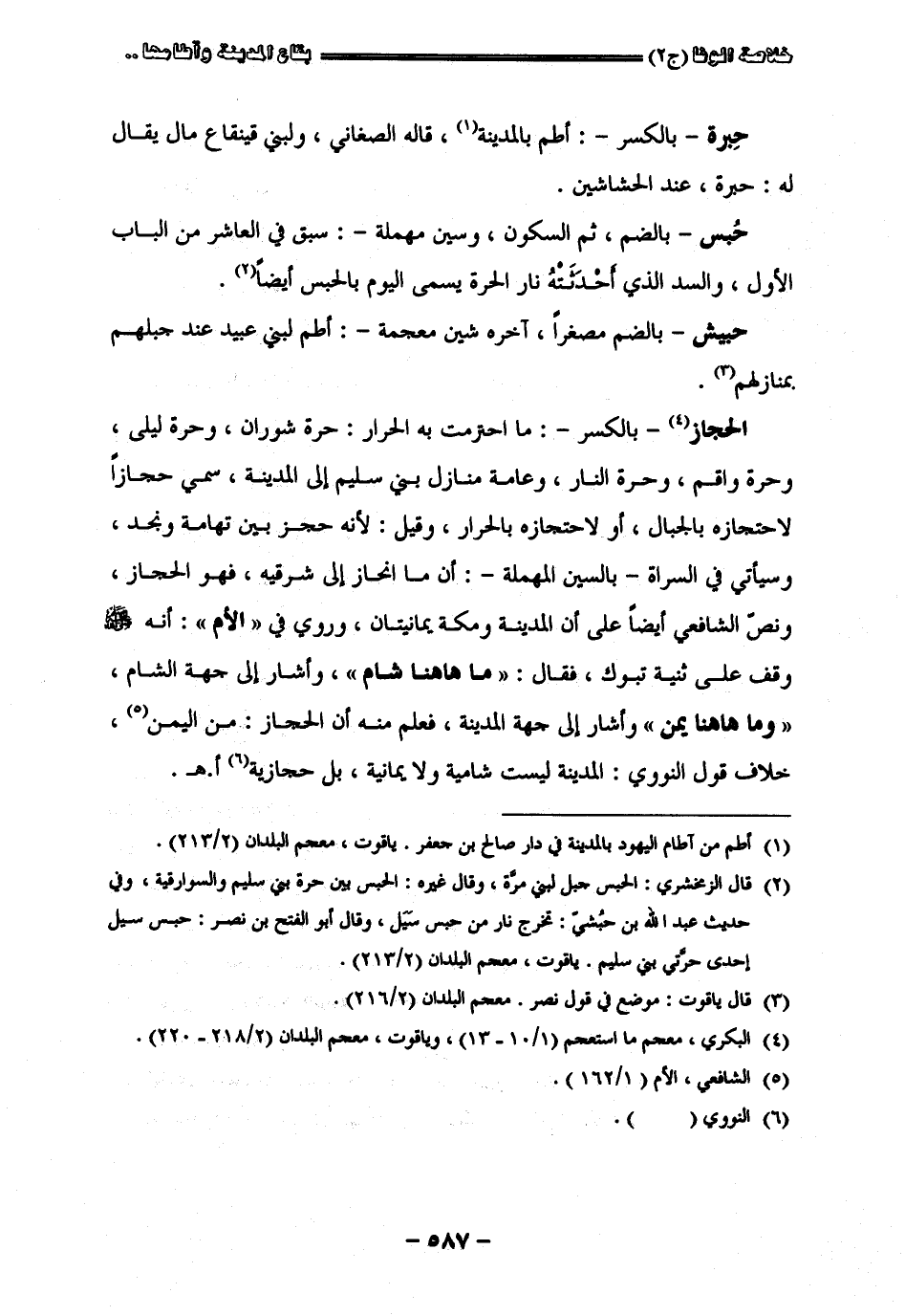 حبرة " بالكسر أطم بالمدينة قاله الصغاني ولبني قينقاع مال يقال له حبرة عند الحشاشين " حبس " بالضم ثم السكون وسين مهملة سبق في العاشر من الباب الأوّل والسدّ الذي أحدثته نار الحرة يسمى اليوم بالحبس أيضا " حبيش " بالضم مصغر آخر مشين معجمة أطم لبني عبيد عند جبلهم بمنازلهم " الحجاز " بالكسر مكة والمدينة واليمامة ومخاليقها قاله الشافعيّ وقال الأصمعي الحجاز ما احترمت به الحرار حرة شوران وحرة ليلى وحرة واقم وحرة النار وعامة منازل بني سليم إلى المدينة سمى حجازا لاحتجازه بالجبال أو لاحتجازه بالحرار وقيل لأنه حجز بين تهامة ونجد وسيأتي في السراة بالسين المهملة إن ما أنحاز إلى شرقية فهو الحجاز ونص الشافعيّ أيضا أن المدينة ومكة يمانيتان وروى في الأم أنه صلى الله عليه وسلم وقف على ثنية تبوك فقال ما ههنا شام وأشار إلى جهة الشام وما ههنا يمن وأشار إلى جهة المدينة فعلم منه إن الحجاز من اليمن خلاف قول النوويّ المدينة ليست شامية ولا يمانية بل حجازية اه