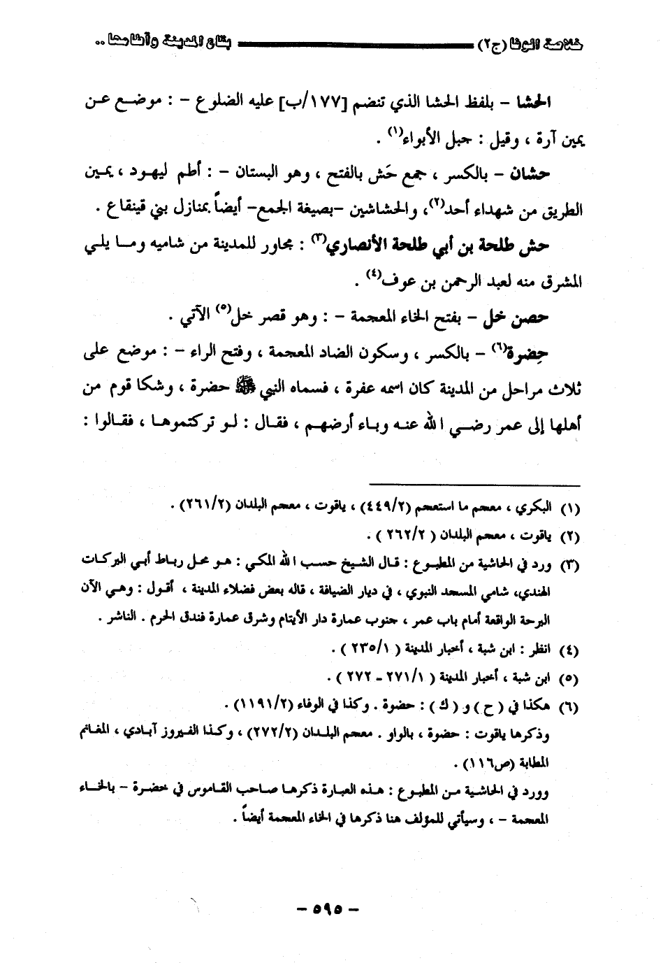 " الحشا " بلفظ الحشا الذي تنضم عليه الضلوع موضع عن يمين آرة وقيل جبل الأبواء " حسان " بالمسر جمع حش بالفتح وهو البستان أطم ليهود يمين الطريق من شهداء أحد والحشاشين بضيعة الجمع أيضا بمنازل بني قينقاع " حش طلحة بن أبي طلحة الأنصاري " مجاور للمدينة من شامية وما يلي المشرق منه لعبد الرحمن بن عوف " حصن خل " بفتح الخاء المعجمة وهو قصر خل الآتي " حضره " بالكسر وسكون الضاد المعجمة وفتح الراء موضع على ثلاث مراحل من المدينة كان اسمه عفرة فسماه النبيّ صلى الله عليه وسلم حضرة وشكا قوم من أهلها إلى عمر رضي الله عنه وباء أرضهم فقال لو تركتموها فقالوا