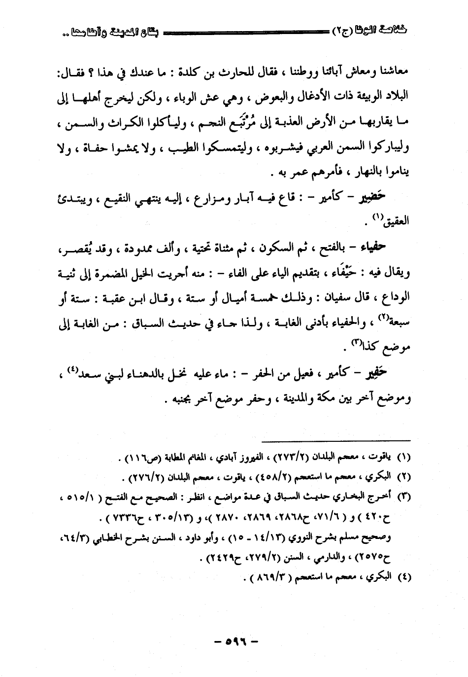 معاشنا ومعاش آبائنا ووطننا فقال للحرث بن كلدة ما عندك في هذا فقال البلاد الوبئة ذات الأدغال والبعوض وهي عش الوباء ولكن ليخرج أهلها إلى ما يقاربها من الأرض العذبة إلى مرتيع النجم وليأكلوا الكراث والسمن وليباكروا السمن العربي فيشربوه وليمسكوا الطيب ولا يمشوا حفاة ولا يناموا بالنهار فأمرهم عمر به " حضير " كأمير قاع فيه آبار ومزارع إليه ينتهي النقيع ويبتدئ العقيق " حفياء " بالفتح ثم السكون ثم مثناة تحتية وألف ممدودة وقد يقصر ويقال فيه حيفاء بتقديم الياء على الفاء منه أجريت الخيل المضمرة إلى ثنية الوداع قال سفيان وذلك خمسة أميال أو ستة وقال أبن عقبة ستة أو سبعة والحفياء بأدنى الغابة ولذا جاء في حديث السباق من الغابة إلى موضع كذا " حفير " كأمير فعيل من الحفر ماء عليه نخل بالدهناء لبني سعد وموضع آخر بين مكة والمدينة وحفر موضع آخر بجنبه