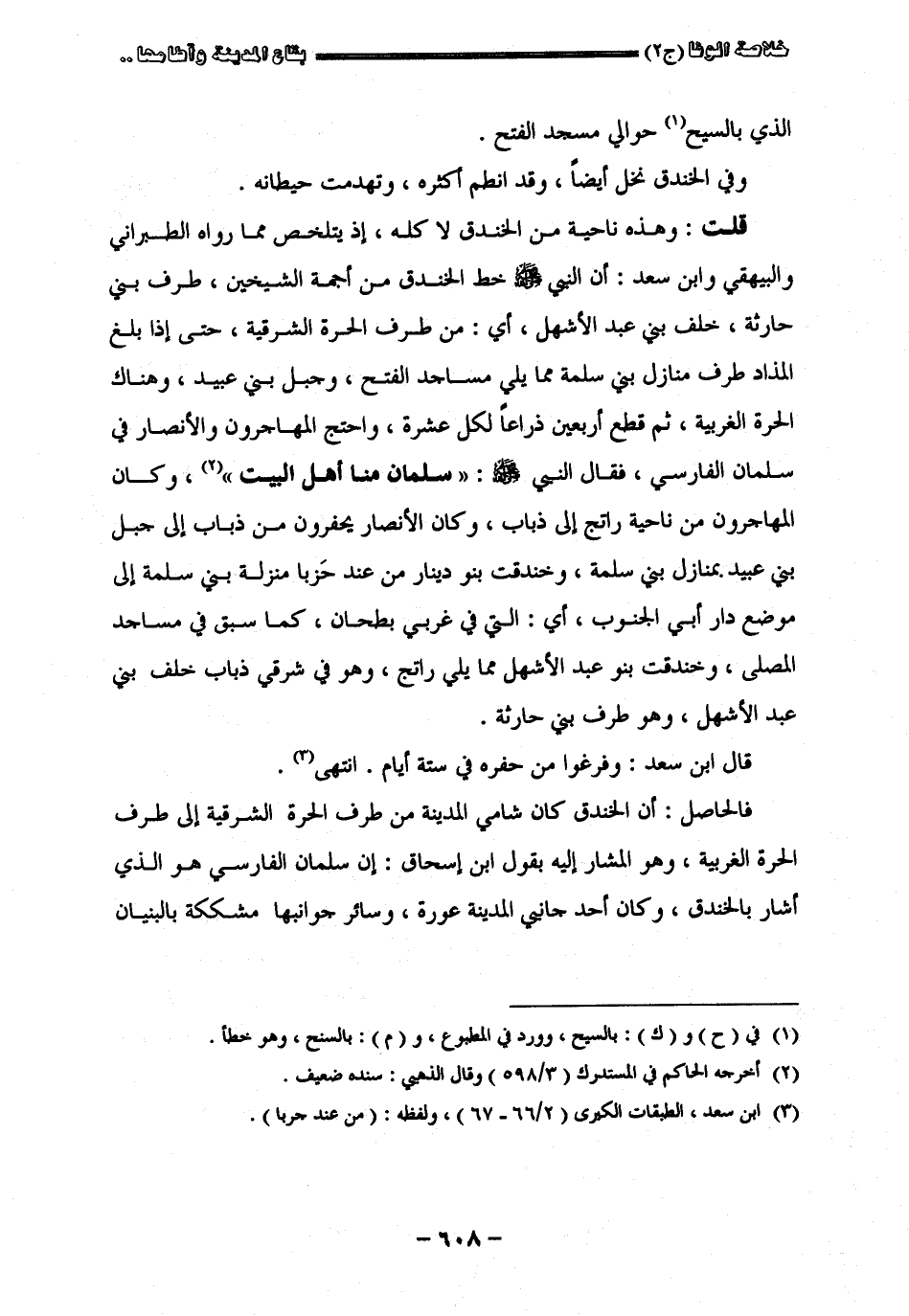الذي بالسنح حوالي مسجد الفتح وفي الخندق نخل أيضا وقد أنطمّ أكثره وتهدمت حيطانه " قلت " وهذه ناحية من الخندق لأكله إذ يتلخص مما رواه الطبراني والبيهقي وأبن سعد إن النبي صلى الله عليه وسلم خط الخندق من أجمة الشيخين طرف بني حارثة خلف بني عبد الأشهل أي في طرف الحرّة الشرقية حتى إذا بلغ المذاد طرف منازل بني سلمة مما يلي مساجد الفتح وجبل بني عبيد وهناك الحرّة الغربية ثم قطع أربعين ذراعا لكل عشرة واحتج المهاجرون والأنصار في سلمان الفارس فقال النبي صلى الله عليه وسلم سلمان منا أهل البيت وكان المهاجرون من ناحية راتج إلى ذباب وكان الأنصار يحفرون من ذباب إلى جبل بني عبيد بمنازل بني سلمة وخندقت بنو دينار من عند خزبي منزلة بني سلمة إلى موضع دار أبن أبي الجنوب أي التي في غربي بطحان كما سبق في مساجد المصلى وخندقت بنو عبد الأشهل مما يلي راتج وهو في شرقي ذباب إلى بني خلف عبد الأشهل وهو طرف بني حارثة قال أبن سعد وفرغوا من حفره في ستة أيام انتهى فالحاصل إن الخندق كان شامي المدينة من طرف الحرة الشرقية إلى طرف الحرة الغربية وهو المشار إليه بقول أبن أسحق إن سلمان الفارسي هو الذي أشار بالخندق وكان أحد جانبي المدينة عورة وسائر جوانبها مشككة بالبنيان