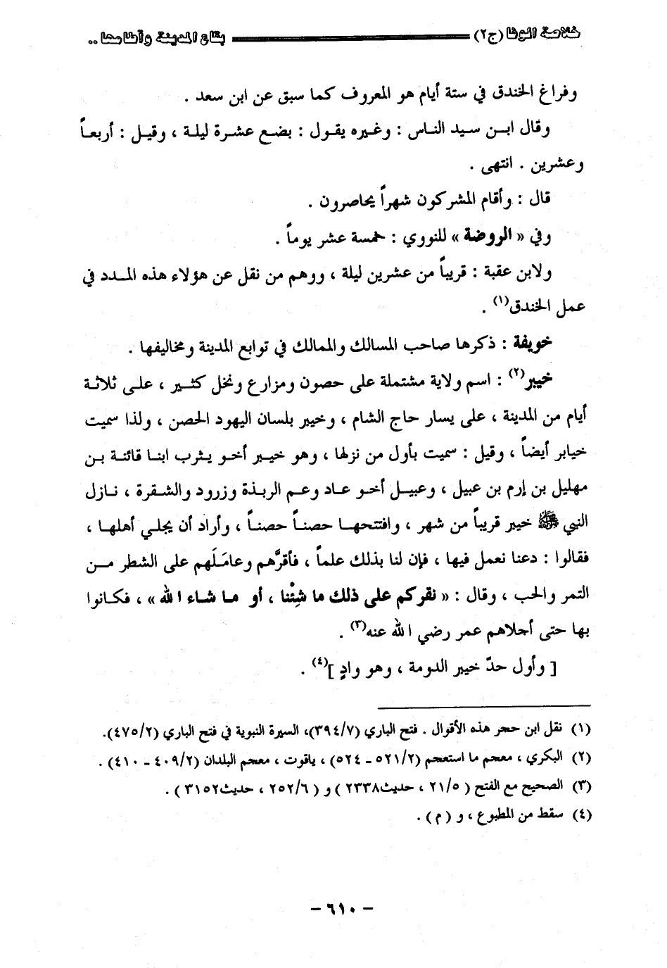 وفراغ الخندق في ستة أيام هو المعروف كما سبق عن أبن سعد وقال أبن سيد الناس وغيره يقول بضع عشرة ليلة وقيل أربعا وعشرين انتهى قال وأقام المشركون شهرا يحاصرون وفي الروضة للنووي خمسة عشر يوما ولأبن عقبة قريبا من عشرين ليلة ووهم من نقل عن هؤلاء هذه المدد في عمل الخندق " خويفة " ذكرها صاحب المسالك والممالك في توابع المدينة ومخاليفها " خيبر " اسم ولاية مشتملة على حصون ومزارع ونخل كثير على ثلاثة أيام من المدينة على يسار حاج الشام وخيبر بلسان اليهود الحصن ولذا سميت خيابر أيضا وقيل سميت بأوّل من نزلها وهو خيبر أخو يثرب أبنا قانئة مهليل بن ارم بن عبيل وعبيل أخو عاد عمّ الربذة وزود والشقرة نازل النبي صلى الله عليه وسلم خيبر قريبا من شهر وافتتحها حصنا حصنا وأراد أن يجلى أهلها فقالوا دعنا نعمل فيها فأنّ لنا بذلك علما فأقرهم وعاملهم على الشعار من التمر والحبّ وقال نفركم على ذلك ما شئنا أو ما شاء الله فكانوا بها حتى أجلاهم عمر رضي الله عنه