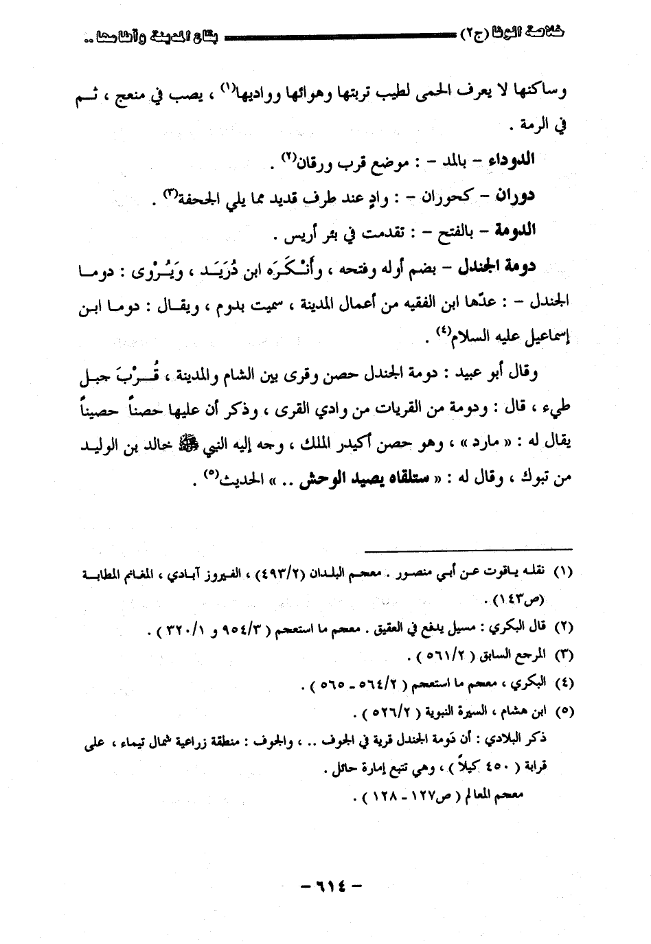 وقال أبن سعد دومة الجندل طرف من الشام بينها وبين دمشق خمس ليال وبينها وبين المدينة خمس عشرة ليلة غزاها النبي صلى الله عليه وسلم ونزل بساحة أهلها فلم يلق أحد فأقام بها أياما وبث السرايا وقال أبن هشام أن النبي صلى الله عليه وسلم رجع قبل أن يصلها وزعم بعضهم أنّ تحكيم الحكمين كان بدومة الجندل وفي كتاب الخوارج عن أبن أبي ليلى حديث في ذلك " الدويخل " بالضم مصغرا جبل بني عبيد وهو أحد الجبلين اللذين غربي مساجد الفتح.
