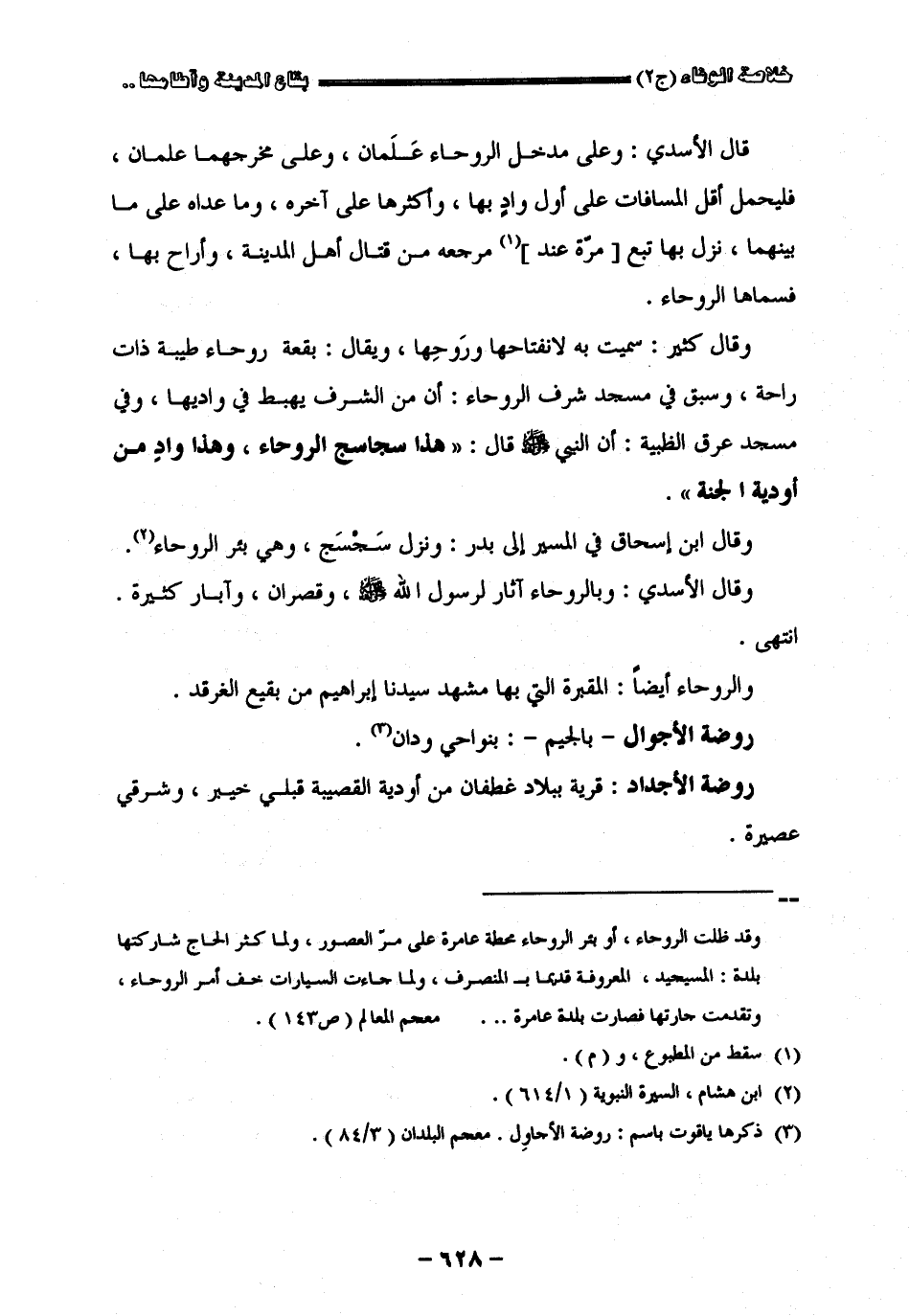 قال الأسدي وعل مدخل الروحاء علمان وعلى مخرجها علمان فليحمل اقل المسافات على أول واديها وأكثرها على آخره وما عداه على ما بينهما نزل بها تبع مرجعه من قتال أهل المدينة وأراح بها فسماها الروحاء وقال كثير سميت به لانفتاحها وروحها ويقال بقعة الروحاء طيبة ذات راحة سبق في مسجد شرف الروحاء أن من الشرف يهبط في واديها وفي مسجد عرق الظبية أن النبي صلى الله عليه وسلم قال هذا سجاسج الروحاء وهذا واد من أودية الجنة وقال ابن اسحق في المسير الى بدر ونزول سجسج وهي بئر الروحاء وقال الاسدي وبالروحاء آثار لرسول الله صلى الله عليه وسلم وقصران وابار كثيرة انتهى والروحاء أيضا المقبرة التي بها مشهد سيدنا إبراهيم من بقيع الفرقد " روضة الأجوال " بالجيم بنواحي ودان " روضة الأجداد " قرية ببلاد غطفان من أودية القصيبة قبلي خيبر وشرقي عصيرة