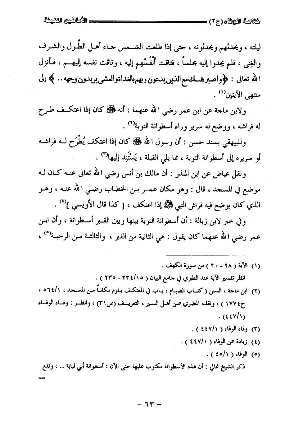 ليلته ويحدثهم ويحدثونه حتى إذا طلعت الشمس جاء أهل الطول والشرف والغنى ولم يجدوا إليه مجلسا فتاقت أنفسهم إليه وتاقت نفسه إليهم فأنزل الله تعالى وأصبر نفسك مع الذين يدعون ربهم بالغداة والعشيّ يريدون وجهه إلى منتهى الآيتين ولأبن ماجة عن ابن عمر رضي الله عنه أنه صلى الله عليه وسلم كان إذا أعتكف طرح له فراشه ووضع له سرير وراء أسطوانة التوبة وللبيهقي بسند حسن أن رسول الله صلى الله عليه وسلم كان إذا أعتكف يطرح فراشه أو سريره إلى أسطوانة التوبة مما يلي القبلة يستند إليها ونقل عياض عن ابن المنذر أن مالك بن أنس رضي الله عنه تعالى عنه كان له موضع في المسجد قال وهو مكان عمر بن الخطاب رضي الله عنه وهو الذي كان يوضع فيه فراش النبي صلى الله عليه وسلم إذا أعتكف وفي خبر لأبن زبالة أن أسطوانة التوبة بينها وبين القبر أسطوانة وأن ابن عمر رضي الله عنه كان يقول هي الثانية من القبر والثالثة من الرحبة