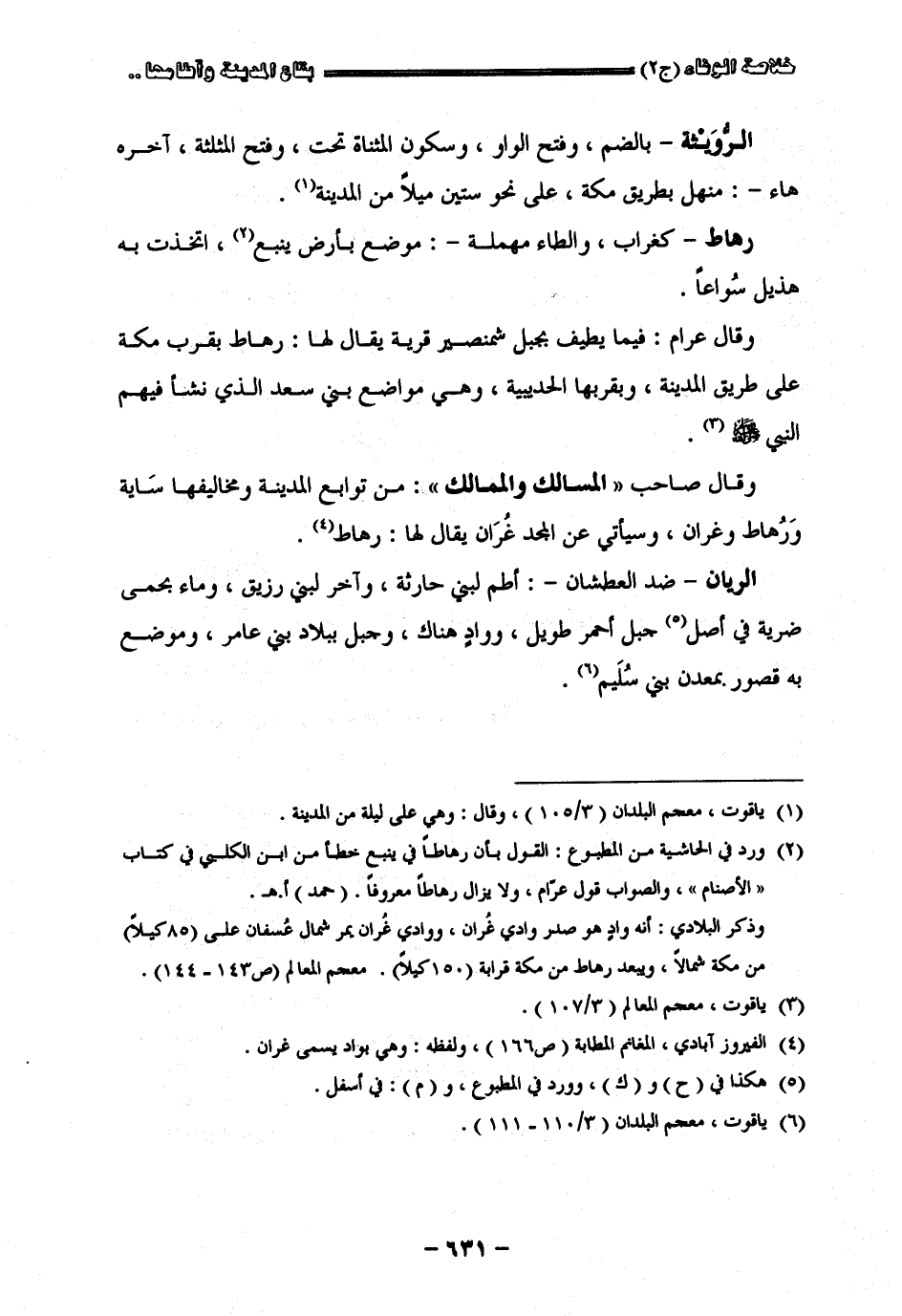 " الرويثة " بالضم وفتح الواو وسكون المثناة تحت وفتح المثلثة آخره هاء منهل بطريق مكة على نحو ستين ميلا من المدينة " رهاط " كغراب والطاء مهملة موضع بأرض ينبع اتخذت به هذيل سواعا وقال عرام فيما يطيف بحبل شمنصير قرية يقال لها رهاط بقرب مكة على طريق المدينة وبقربها الحديبية وهي مواضع بني سعد الذي نشأ فيهم النبيّ صلى الله عليه وسلم وقال صاحب المسالك والممالك من توابع المدينة ومخاليفها ساية ورهاط وعران وسيأتي عن المجد عران يقال لها رهاط " الريان " ضد العطشان أطم لبني حارثة وآخر لبني زريق وماء بحمى ضرية في أسفل جبل أحمر طويل وواد هناك وجبل ببلاد بني عامر وموضع به قصور بمعدن بني سليم