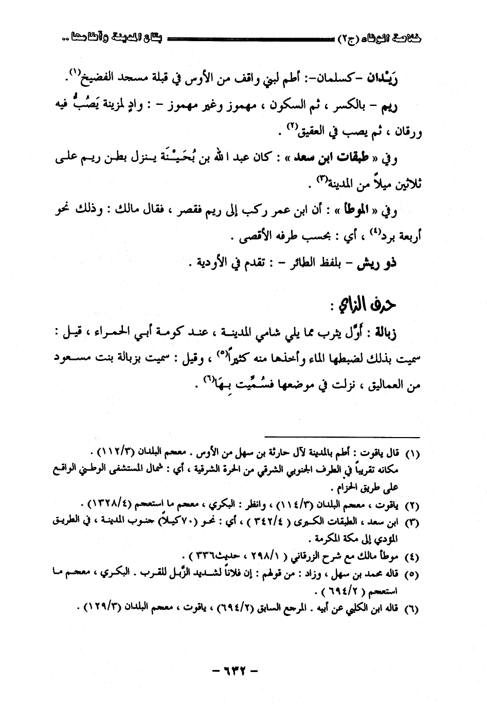 " ريدان " كسلمان أطم لبني واقف من الأوس في قبلة مسجد الفضيخ " ريم " بالكسر ثم السكون مهموز وغير مهموز واد لمزينة يصب فيه ورقان ثم يصب في العقيق وفي طبقات أبن سعد كان عبد الله بن بحينة ينزل بطن ريم على ثلاثين ميلا من المدينة وفي الموطأ أنّ أبن ركب إلى ريم فقصر قال مالك وذلك نحو أربعة برد أي بحسب طرفه الأقصى " ذو ريش " بلفظ ريش الطائر تقدم في الأودية.