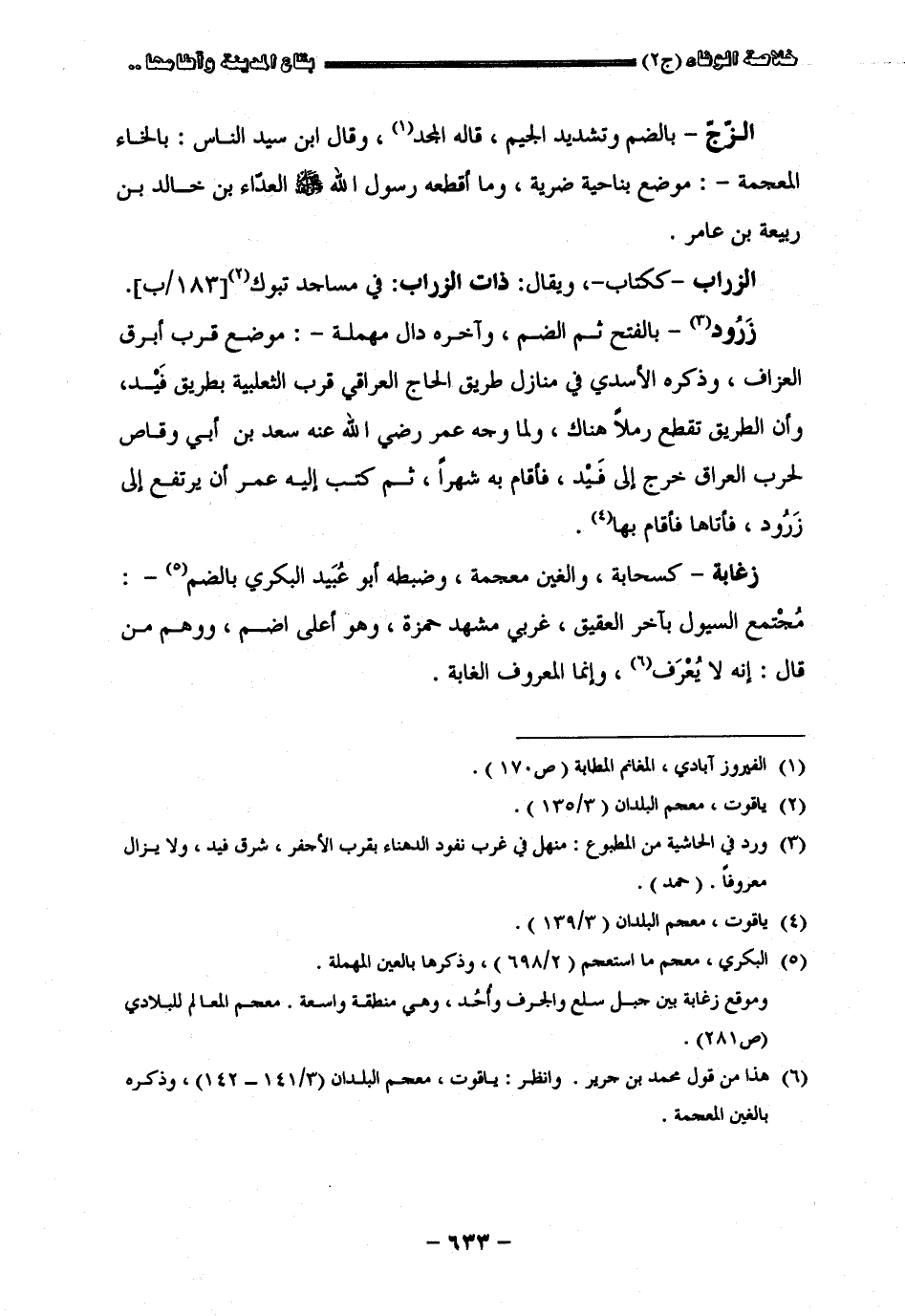 " الزجّ " بالضم وتشديد الجيم قاله المجد وقال أبن سيد الناس بالخاء المعجمة موضع بناحية ضربة وما أقطعه رسول الله صلى الله عليه وسلم العدّاء بن خالد من ربيعة بن عامر " الزراب " ككتاب ويقال ذات الزراب في مساجد تبوك " زرود " بالفتح ثم الضم وآخره ذال مهملة موضع قرب أبرق العزاف وذكره الأسدي في منازل طريق الحاج العراقي قرب الثعلبية بطريق فيد وأنّ الطريق تقطع رملا هناك ولما وجه عمر رضي الله عنه سعد بن أبي وقاص لحرب العراق خرج إلى فيد فأقام به شهرا ثم كتب إليه عمر أن يرتفع إلى زرود فأتاها فأقام بها " زغابة " كسحابة والغين معجمة وضبطه أبو عبيد البكري بالضم مجتمع السيول بآخر العقيق غربي مشهد حمزة وهو أعلى أضم ووهم من قال إنه لا يعرف وإنما المعروف الغاية