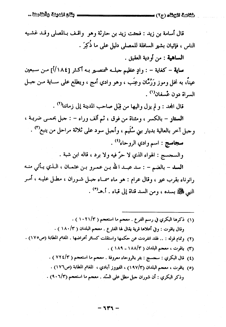 قال أسامة بن زيد فجئت زيد بن حارثة وهو واقف بالمصلى وقد غشيه الناس فإتيان بشير السافلة للمصلى دليل على ما ذكر " الساهية " من أودية العقيق " ساية " كغاية واد عظيم جبله شمنصرية أكثر من سبعين عينابه نخل وموزورمان وعنب وهو وادي أمج ويطلع على ساية من جبل السراة دون عسفان قال المجد ولم يزل واليها من قبل صاحب المدينة إلا في زماننا " الستار " بالكسر ومثناة من فوق ثم ألف وراء جبل بحمى ضرية وجبل آخر بالعالية بديار بني سليم واجبل سود على ثلاثة مراحل من ينبع " سجاسج " اسم وادي الروخاء والسجسج الهواء الذي لا حر فيه قال ابن سبة " السد " بالضم سد عبد الله بن عمرو بن عثمان الذي يأتي منه رانونا يقرب عبر وقال عرام هو ما سما جبل شوران مطل عليه أمر النبي صلى الله عليه وسلم بسده ومن السد قناة إلى قباء اه