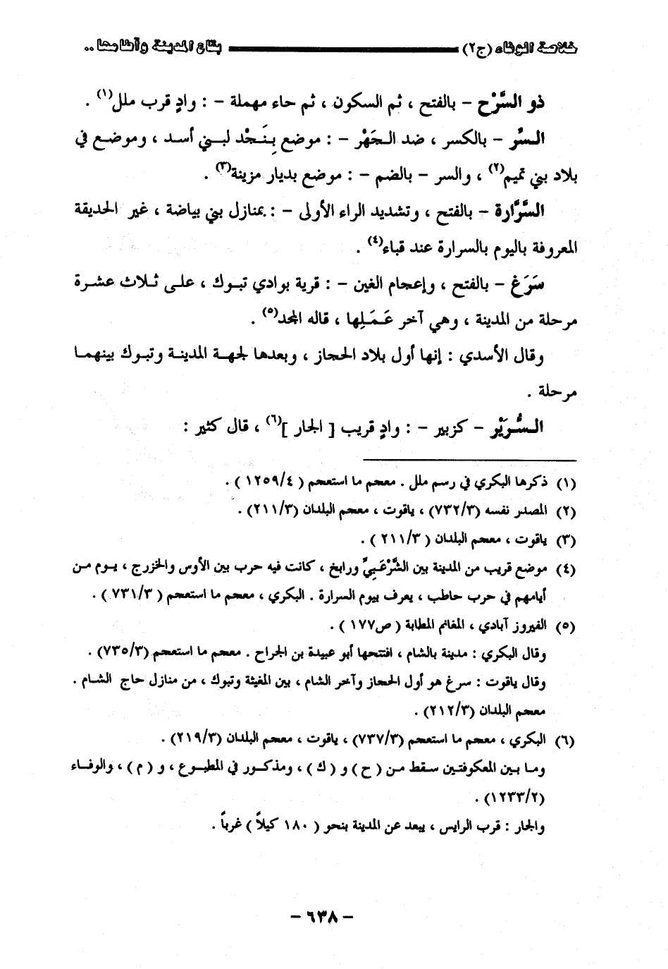 " ذو السرح " بالفتح ثم السكون ثم حاء مهملة واد قرب مال " السر " بالكسر ضد الجهر موضع بنجد لبني أسد وموضع في بلاد غيم والسر بالضم موضع بديار مزينة " السرارة " بالفتح وتشديد الراء الأولى بمنازل بني بياضة غير الحديقة المعروفة اليوم بالسرارة عند قباء " سرغ " بالفتح وإعجام الغين قرية بوادي تبوك على ثلاث عشرة مرحلة من المدينة وهي آخر عملها قاله المجد وقال الأسدي إنها أول بلاد الحجاز وبعدها لجهة المدينة وتبوك بينهما مرحلة " السرير " كزبير واد قرب الجار قال كثير