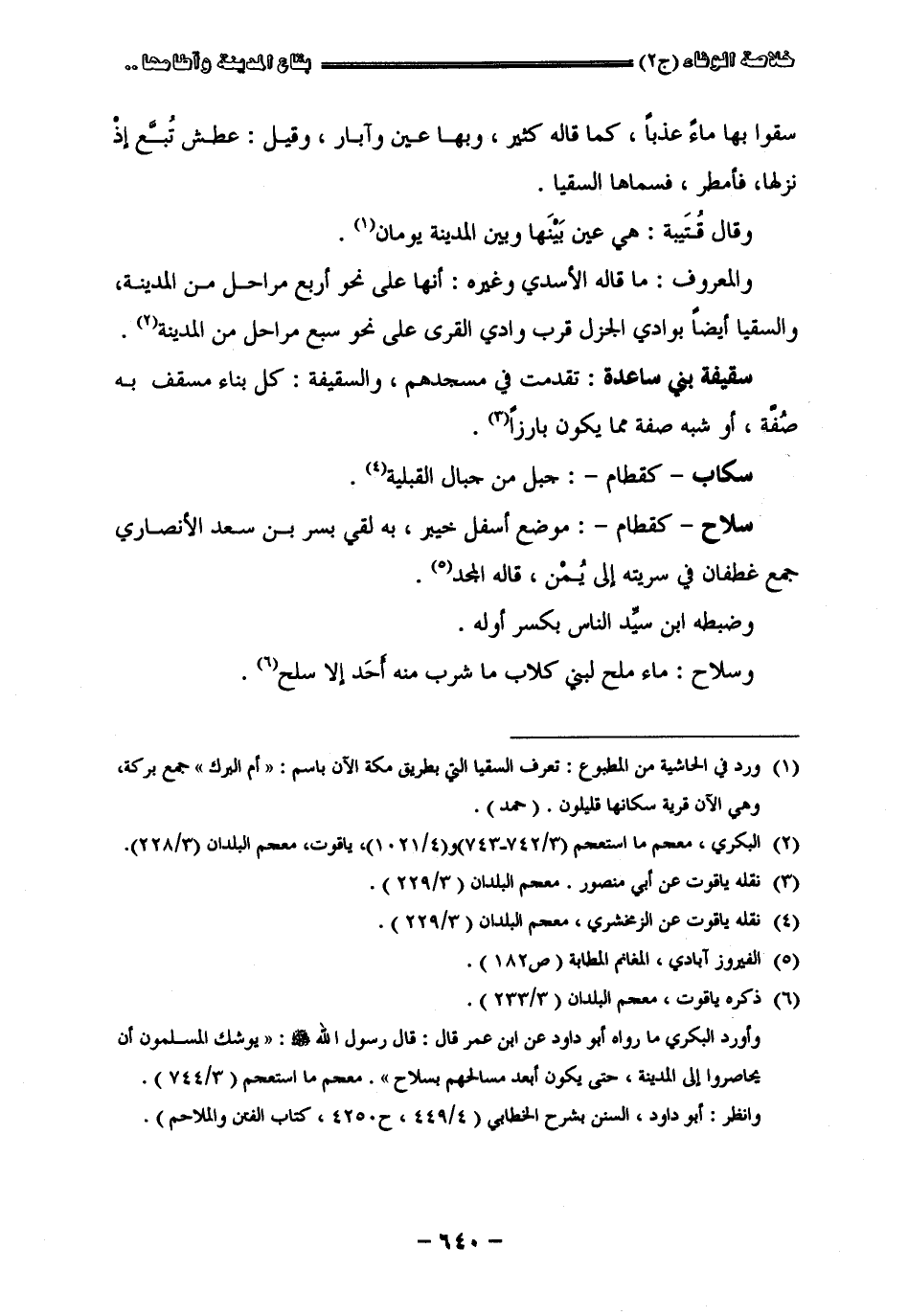 سقوا بها ماء عذبا كما قاله كثير وبها عين وآبار وقيل عطش تبع إذ نزلها فأمطر فسماها السقيا وقال قتيبة هي عين بينها وبين المدينة يومان والمعروف ما قاله الأسدي وغيره أنها أعلى نحو أربع مراحل من المدينة والسقيا أيضا بوادي الجزل قرب وادي القرى على نحو سبع مراحل من المدينة " سقيفة بني ساعدة " قدمت في مسجدهم والسقيفة كل بناء مسقف به صفة أو شبه صفة مما يكون بارزا " سكاب " كقطام جبل من جبال القبلية " سلاح " كقطام موضع أسفل خيبر به لقي بشر بن سعد الأنصاري جمع غطفان في سريته إلى يمن قاله المجد وضبطه ابن سيد الناس بكسر أوله وسلاح ماء ملح لبني كلاب ما شرب منه أحد الأسلح