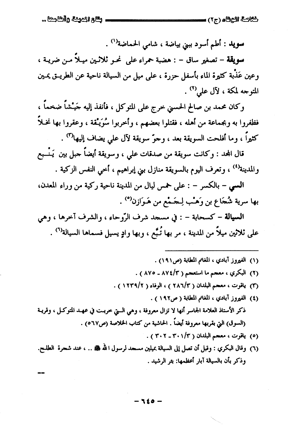 " سويد " أطم أسود ببني بياضة شامي الحاضة " سويقة " تصغير ساق هضبة حمراء على نحو ثلاثين ميلا من ضرية وعين عذبة كثيرة الماء بأسفل حزرة على ميل من السيالة ناحية عن الطريق يمين المتوجه لمكة لآل علي وكان محمد بن صالح الحسني خرج على المتوكل فأنفذ إليه جيشا ضخما فظ فروا به وبجماعة من أهله فقتلوا بعضهم وأخربوا سويقة وعقروا بها نخلا كثيرا وما أفلحت السويقة بعد وجو سويقة لآل علي يضاف إليها قال المجد وكانت سويقة من صدقات علي وسويقة أيضا جبل بني ينبع والمدينة وتعرف اليوم بالسويقة منازل بني إبراهيم أخي النفس الزكية " السيّ " بالكسر على خمس ليال من المدينة ناحية ركية من وراء المعدن بها سرية شجاع بن وهب لجمع من هوازن " السيالة " كسحابة في مسجد شرف الروحاء والشرف آخرها وهي على ثلاثين ميلا من المدينة مر بها تسع وبها واد يسيل فسماه السيالة