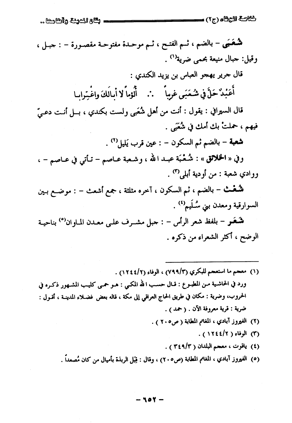 قال السيرافي يقول أنت من أهل شعبي ولست بكندي بل أنت دعيّ فيهم حملت بك أمك في شعبي " شعبة " بالضم ثم السكون عين قرب يليل وفي الخلائق شعبة عبد الله وشعبة عاصم تأتي في عاصم ووادي شعبة من أودية أبلى " شعث " بالضم ثم السكون آخره مثلثة جمع أشعث موضع بين السوارقية ومعدن بني سليم " شعر " بلفظ شعر الرأس جبل مشرف على معدن الماوان بناحية الوضح أكثر الشعراء من ذكره