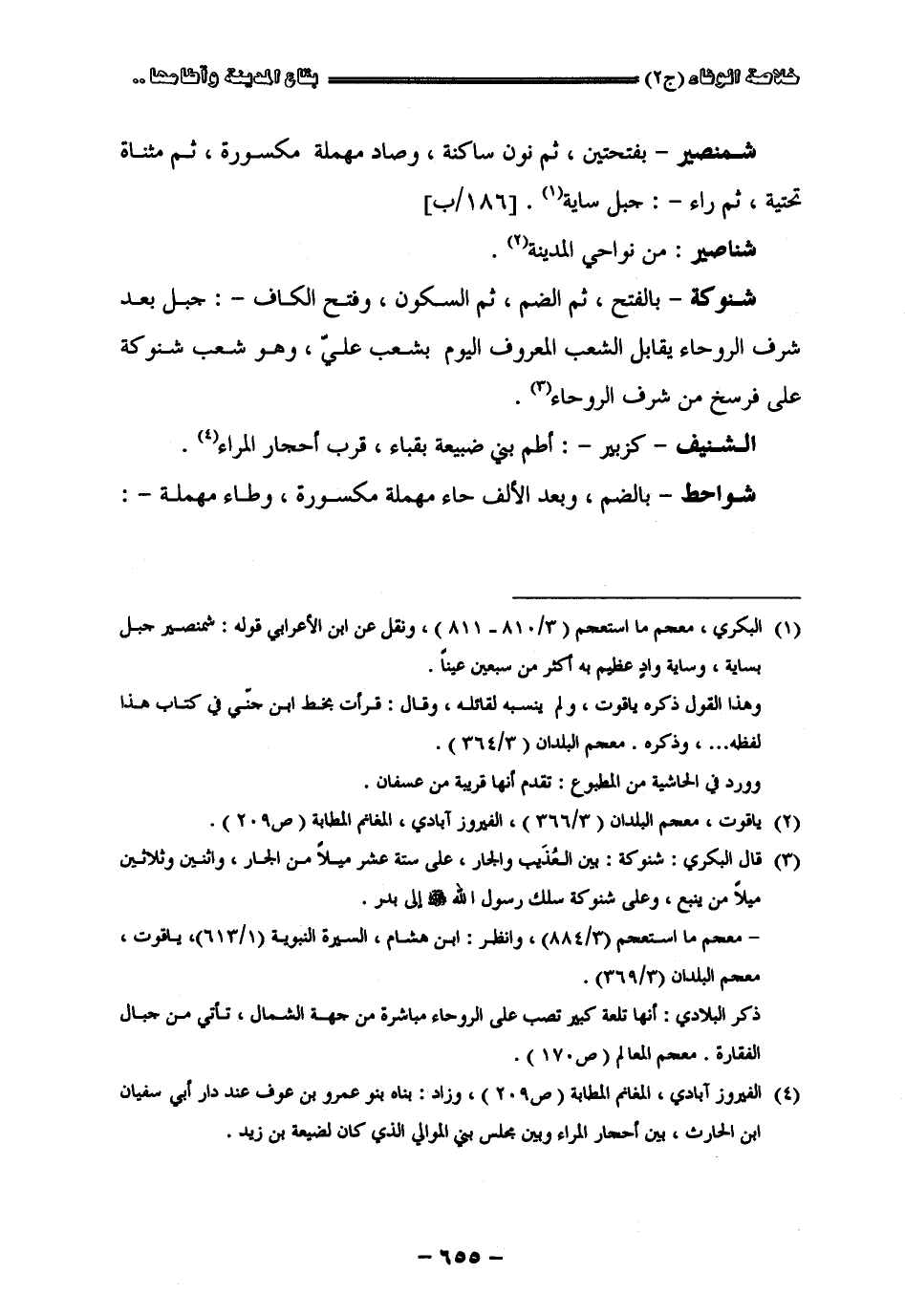 " شمنصير " بفتحتين ثم نون ساكنة وصاد مهملة مكسورة ثم مثناة تحتية ثم راء جبل ساية " شناصير " من نواحي المدينة " شنوكة " بالفتح ثم الضم ثم السكون وفتح الكاف جبل بعد شرف الروحاء يقابل الشعب المعروف اليوم بشعب علي وهو شعب شنوكة على فرسخ من شرف الروحاء " الشنيف " كزبير أطم بني ضبيعة بقباء قرب أحجار المراء " شواحط " بالضم وبعد الألف حاء مهملة مكسورة وطاء مهملة