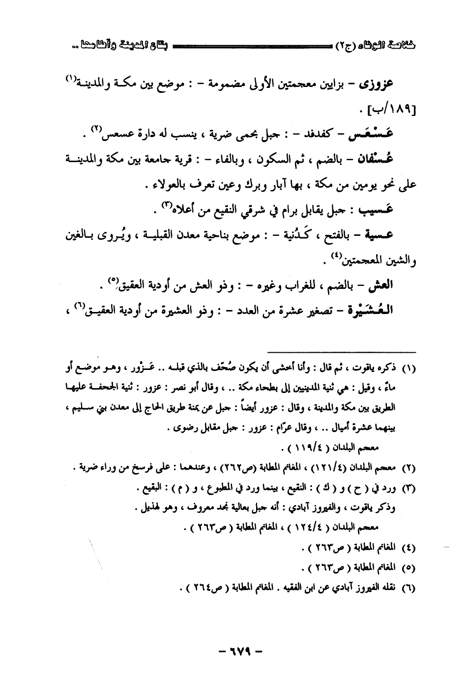 " عزوزي " بزايين معجمتين الأولى مضمومة موضع بين مكة والمدينة " عسعس " كفدفد جبل بحمى ضرية من سبله دارة عسعس " عسفان " بالضم ثم السكون وبالفاء قرية جامعة بين مكة والمدينة على نحو يومين من مكة بها آبار وبرك وعين تعرف بالعولاء " عسيب " جبل يقابل برام في شرق البقيع من أعلاه " عسية " بالفتح كدينة وضع ناحية معدن القبيلة ويروي بالعين والسين المعجمتين " العس " بالضم للغراب وغيره وذو العمر من أودية العقيق