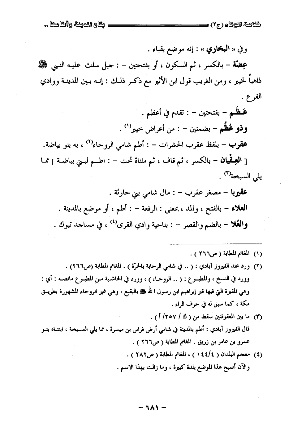 وفي البخاري انه موضع بقباء " عضه " بالكسر ثم السكون أو بفتحتين جبل سلك عليه صلى الله عليه وسلم ذاهبا لخيبر ومن الغريب قول ابن الأثير مع ذكر ذلك انه بين المدينة ووادي الفرع " عظم " بفتحتين تقدم في أعظم بضمتين من أعراض خيبر " عقرب " بلفظ عقرب الحشرات أعلم شامي الروحاء به بنو بياضة " العقبان " بالكسر ثم قاف ثم مثناة تحت أطم بني بياضة مما يلي السبخة " عقبريا " مصغر عقرب مال شامي بني حارثة " العلاء " بالفتح والمدّ بمعنى الرقعة أطم أو موضع بالمدينة والعلا بالضم والقصر بناحية وادي القرى في مساجد تبوك