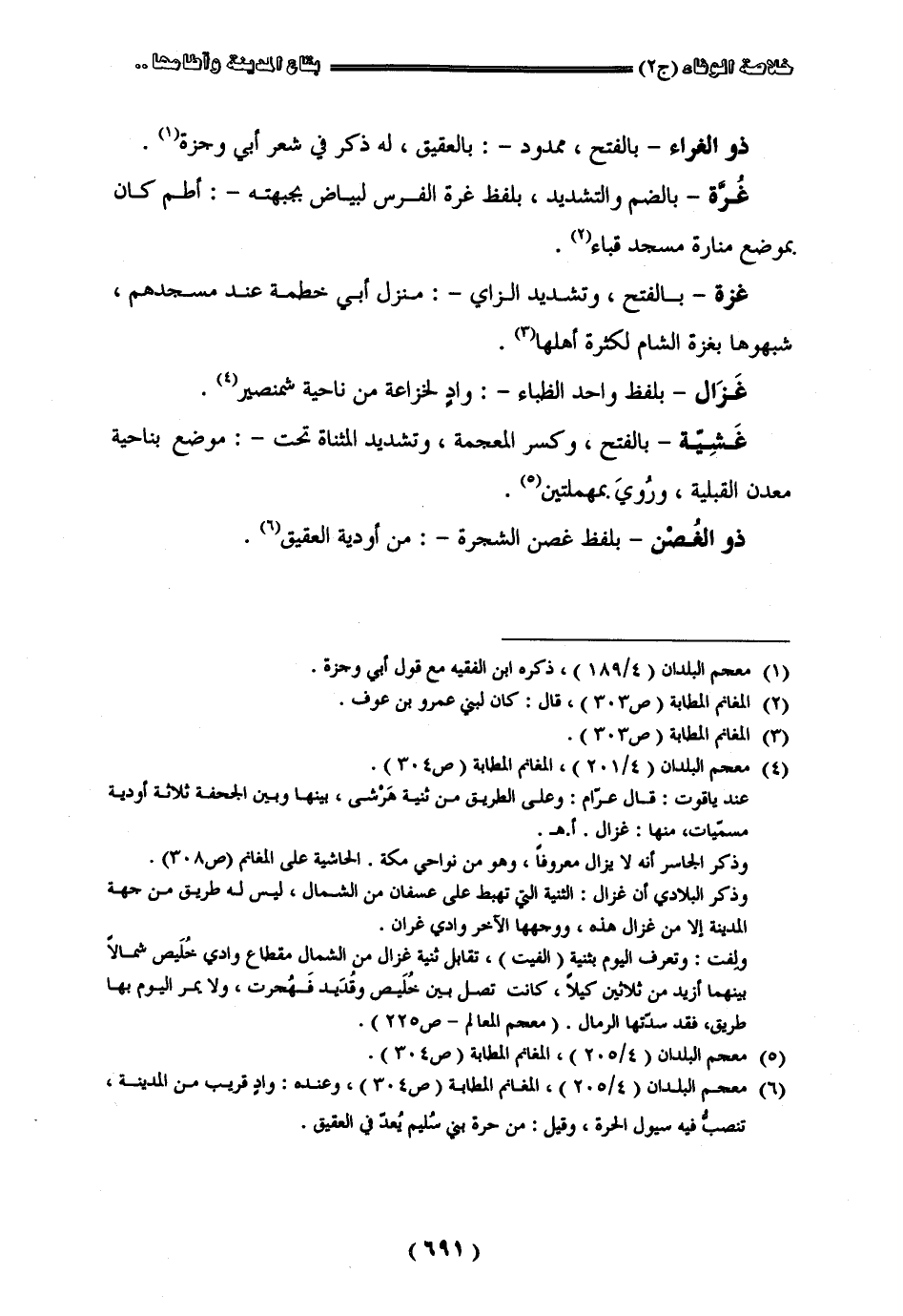" ذو الغراء " بالفتح ممدود بالعقيق له ذكر في شعر أبي وجرة " غرة " بالفتح وتشديد الزاي منزل بني حطمة عند مسجدهم شبهوها بغزة الشام لكثرة أهلها " غزال " بلفظ واحد الظباء واد لخزاعة من ناحية شمنصير " غشية " بالفتح وكسر المعجمة وتشديد المثناة تحت موضع بناحية معدن القبلية وروى بمهملتين " ذو الغصن " بلفظ غصن الشجرة من أودية العقيق