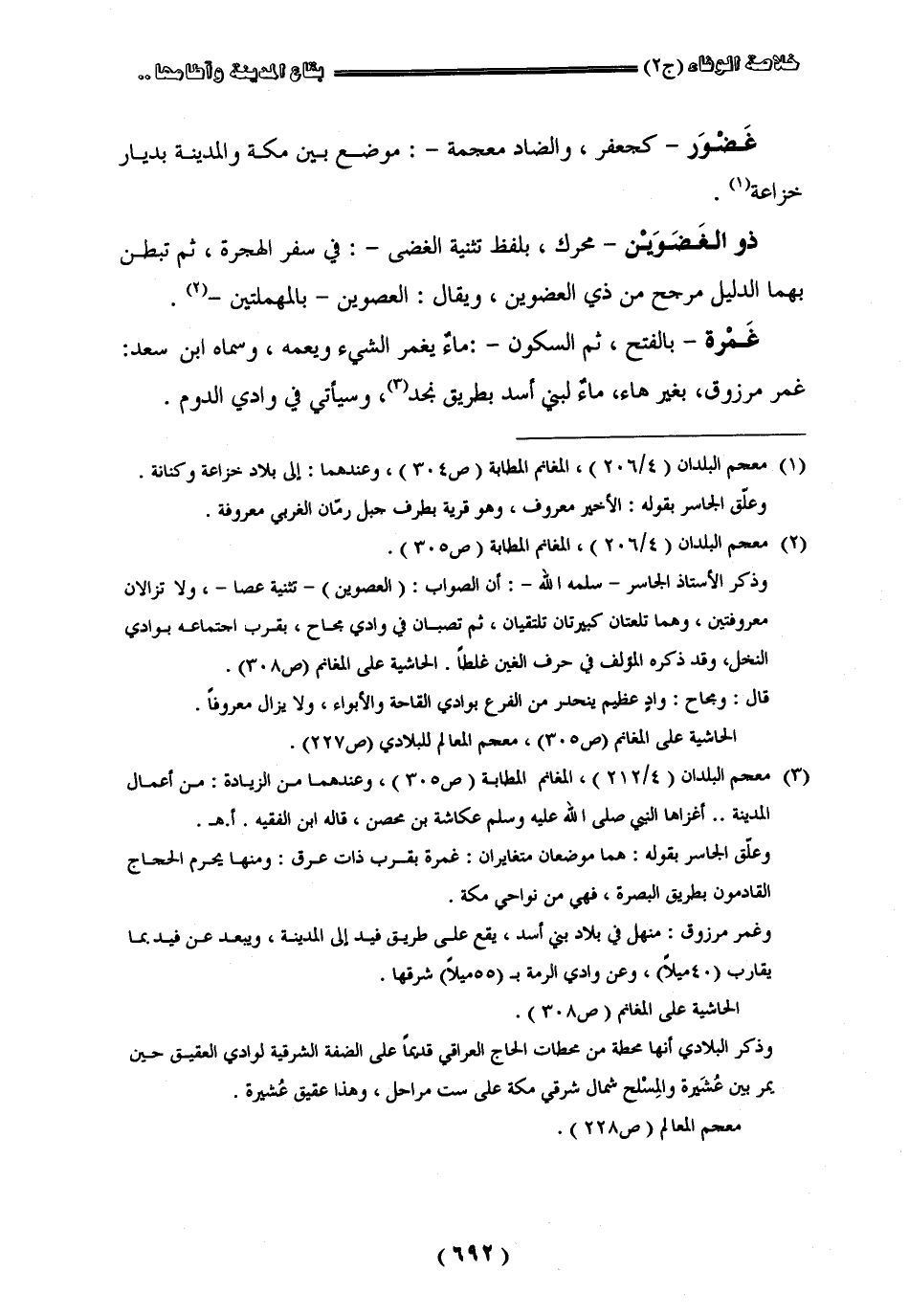 " غضور " كجعفر والضاد معجمة موضع بين مكة والمدينة بديار خزاعة " ذو الغضوين " محرّك بلفظ تثنية الغضى في سفر الهجرة ثم تبطن بهما الدليل مرجح من ذي الغضوين ويقال العصوين بالمهملتين " غمرة " بالفتح ثم السكون ما يغمر الشيء ويعمه وسماه أبن سعد غمر مرزوق بغير هاء ماء لبني أسد بطريق نجد وسيأتي في وادي الدوم