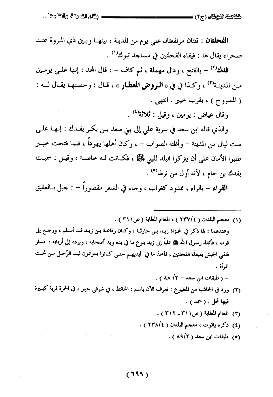 " الفحلتان " قنتان مرتفعتان على يوم من المدينة بينها وبين ذي المروة عند صحراء يقال لها فيفاء الفحلتين في مساجد تبوك " فدك " بالفتح ودال مهملة ثم كاف قال المجد إنها على يومين من المدينة وكذا هو في الروض المعطار قال وحصنها يقال له المسروح بقرب خيبرا انتهى وقال عياض يومين وقيل ثلاثة والذي قاله أبن سعد في سرية عليّ إلى بني سعد بن بكر بفدك إنها على ست ليال من المدينة وأظنه الصواب وكان أهلها يهود فلما فتحت خيبر طلبوا الأمان على أن يتركوا البلد للنبيّ صلى الله عليه وسلم فكانت له خاصة قيل وسميت بفدك بن حام لأنه أوّل من نزلها " الفراء " بالراء ممدود كالغراب وجاء في الشعر مقصورا جبل بالعقيق