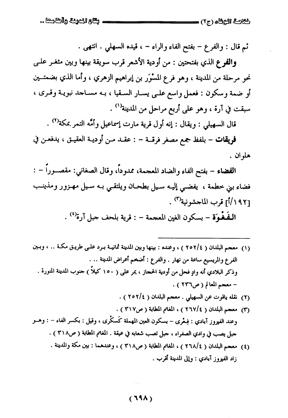 ثم قال والفرع بفتح الفاء والراء قيده السهيليّ انتهى والفرع الذي بفتحتين من أودية الأشعر قرب سويقة بينها وبين مثغر على نحو مرحلة من المدينة وهو فرع المسور بن إبراهيم الزهريّ وأما الذي بضمتين أو ضمة وسكون فعمل واسع عن يسار السقيا به مساجد نبوية وقرى سبقت في آرة وهو على أربع مراحل من المدينة قال السهيلي ويقال إنه أوّل قرية مارت إسماعيل وأمّه التمر بمكة " فريقات " بلفظ جمع مصغر فرقة عقد من أودية العقيق يدفعن في هلوان " الفضاء " بفتح الفاء والضاد المعجمة ممدودا وقال الصغانيّ مقصورا فضاء بني خطمة بفضي إليه سيل بطحان ويلتقي به سيل مهزور ومذينيب قرب الماجشونية " الفغوة " بسكون الغين المعجمة قرية بلحف جبل آرة