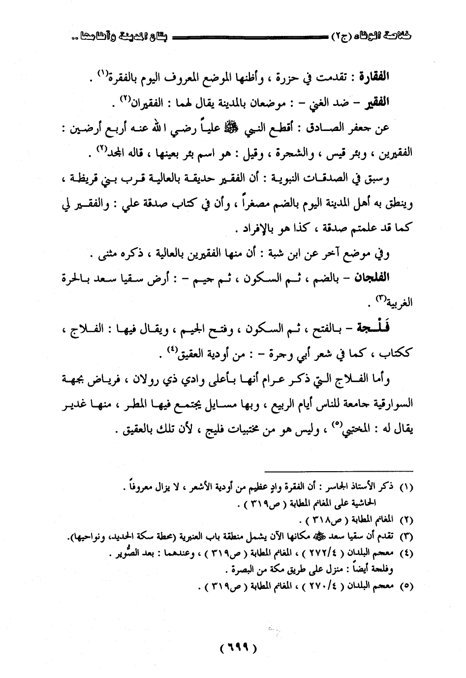 " الفقارة " تقدّمت في حزري وأظنها الموضع المعروف اليوم بالفقرة " الفقير " ضدّ الغني موضعان بالمدينة يقال لهما الفقيران عن جعفر الصادق أقطع النبي صلى الله عليه وسلم عليا رضي الله عنه أربع أرضين الفقيرين وبئر قيس والشجرة وقيل هو اسم بئر بعينها قاله المجد وسبق في الصدقات النبوية إن الفقير حديقة بالعالية قرب بني قريظة وينطق به أهل المدينة اليوم بالضم مصغر أو إنّ في كتاب صدقة عليّ والفقير لي كما قد علمتم صدقة كذا هو بالأفراد وفي موضع آخر من أبن شبة إن منها الفقيرين بالعالية ذكره مثنى " الفلجان " بالضم ثم السكون ثم جيم أرض سقيا سعد بالحرّة الغربية " فلجة " بالفتح ثم السكون وفتح الجيم ويقال فيها الفلاج ككتاب كما في شعر أبي وجرة من أودية العقيق وأما الفلاج التي ذكر عرام إنها بأعلى وادي ذي رولان فرياض بجهة السوارقية جامعة للناس أيام الربيع وبها مسايل يجتمع فيها المطر منها غدير يقال له المختبي وليس هو من مختبيات فليح لأن تلك بالعقيق
