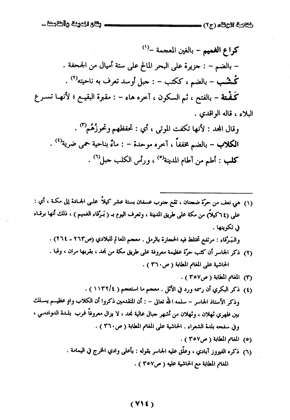 " كراع الغميم " في الغين المعجمة " الكر " بالضم جزيرة على البحر المالح على ستة أميال من الجحفة " كشب " بالضم ككتب جبل أسود تعرف به ناحيته " كفته " بالفتح ثم السكون آخره هاء مقبرة البقيع لأنها تسرع البلاء قاله الواقدي وقال المجد لأنها تكفت الموتى أي تحفظهم وتحوزهم " الكلاب " بالضم مخففا آخره موحدة ماء بناحية حمى ضرية " كلب " أطم من آطام المدينة ورأس الكلب جبل