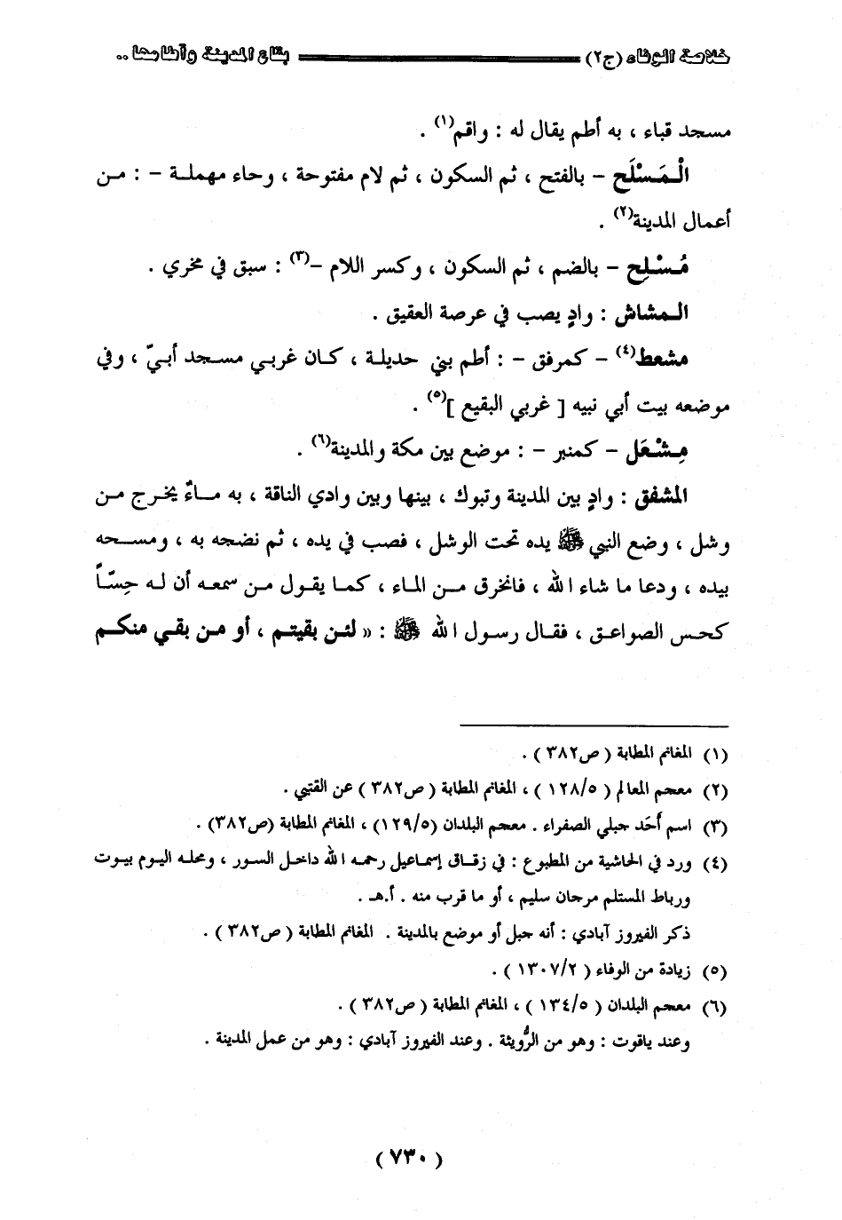 مسجد قباء به أطم يقال له واقم " المسلح " بالفتح ثم السكون ثم لام مفتوحة وحاء مهملة من أعمال المدينة " مسلح " بالضم ثم السكون وكسر اللام سبق في مخرّي " المشاش " واد يسب في عرصة العقيق " مشعط " كمرفق أطم بني جديلة كان غربي مسجد أبيّ وفي موضعه بيت أبي نبيه " مشعل " كمنبر موضع بين مكة والمدينة " المشفق " واد بين المدينة وتبوك بينها وبين وادي الناقة به ماء يخرج من وشل وضع النبيّ صلى الله عليه وسلم يده تحت الوشل فصب في يده ثم نضحه به ومسحه بيده ودعا ما شاء الله فانخرق من الماء كما يقول من سمعه إن له حسا كحس الصواعق فقال رسول الله صلى الله عليه وسلم لئن بقيتم أو من بقى منكم