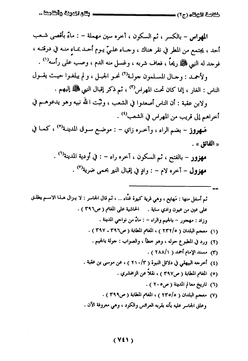 " المهراس " بالكسر ثم السكون آخره سين مهملة ماء بأقصى شعب أحد يجتمع من المطر في نقر هناك وجاء على يوم أحد بماء منه في درقته فوجد له النبي صلى الله عليه وسلم ريحا فعاف شربه وغسل منه الدم وصب على رأسه ولأحمد وجال المسلمون حوله نحو الجبل ولم يبلغوا حيث يقول الناس الغار إنما كان تحت المهراس ثم ذكر إقبال النبي صلى الله عليه وسلم إليهم ولأبن عقبة إن الناس أصعدوا في الشعب وثبت الله نبيه وهو يدعوهم في أخراهم إلى قريب من المهراس في الشعب " مهروز " بضم الراء وآخره موضع سوق المدينة كما في الفائق " مهزور " بالفتح ثم السكون آخره راء في أودية المدينة " مهزول " آخره لام واد في إقبال النير بحمى ضرية