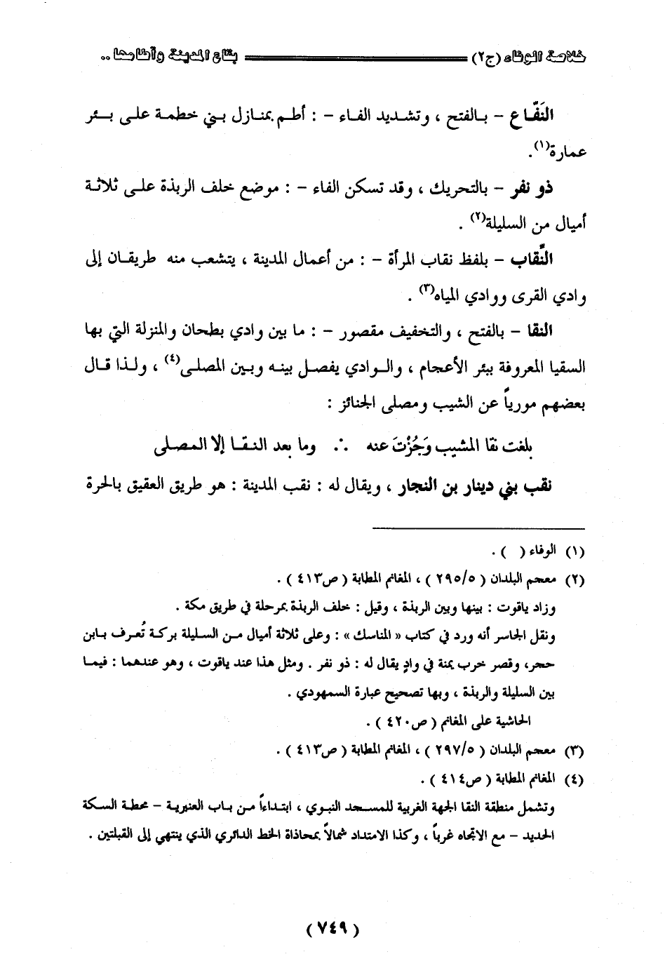 " النفاع " بالفتح وتشديد الفاء أطم بمنازل بني خطمة على بئر عمارة " ذو نفر " بالتحريك وقد تسكن الفاء موضع خلف الربذة على ثلاثة أميال من السليلة " النقاب " بلفظ نقاب المرأة من أعمال المدينة تشعب منه طريقان إلى وادي القرى ووادي المياه " النقا " بالفتح والتخفيف مقصور ما بين وادي بطحان والمنزلة التي بها السقيا المعروفة ببئر الأعجام والوادي يفصل بينه وبين المصلى ولذا قال بعضهم موريا عن الشيب ومصلى الجنائز: