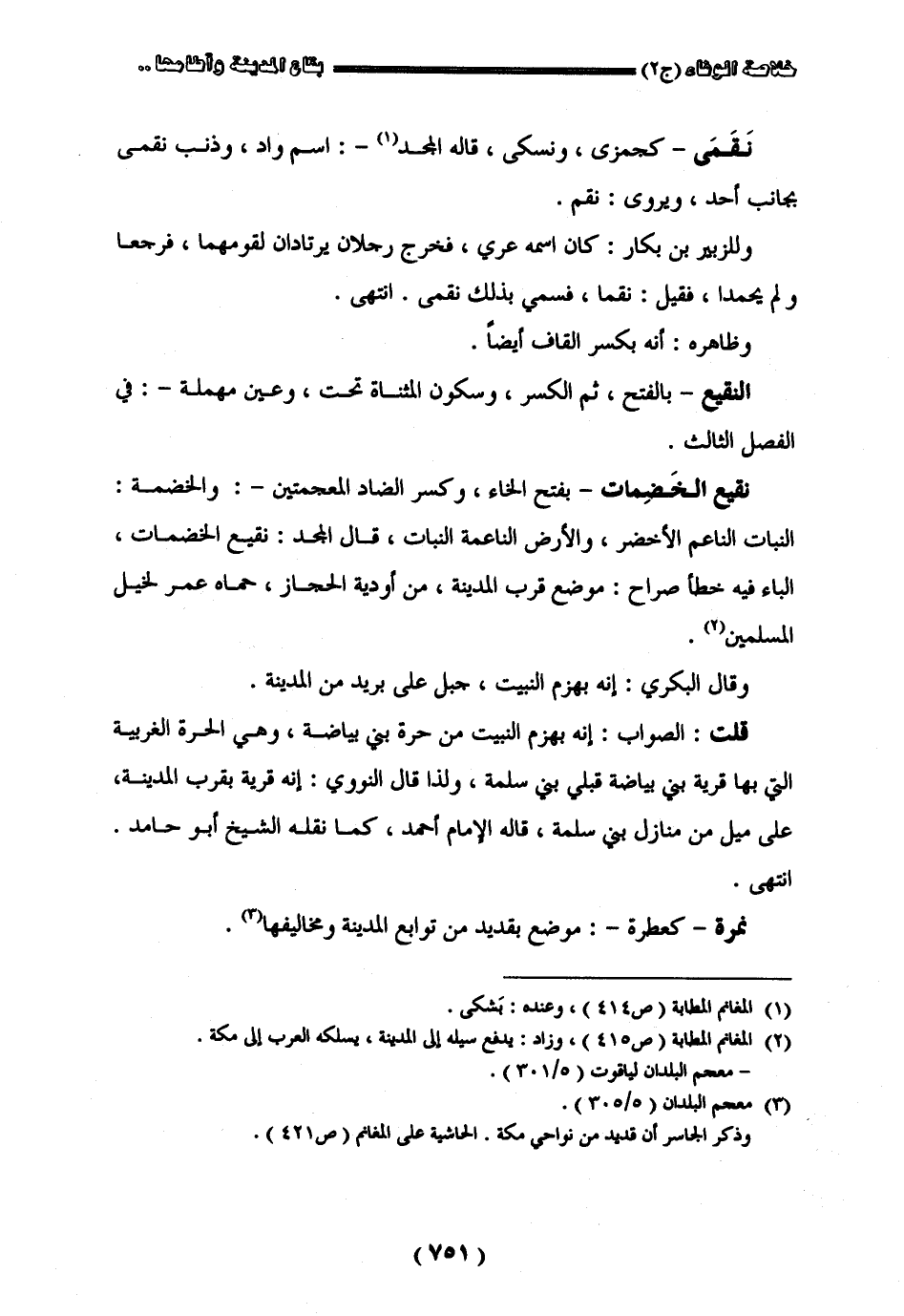 " نقمي " كجمزي ونسكي قاله المجد اسم واد وذنب نقمي بجانب أحد ويروي نقم وللزبير بن بكار كان اسمه عرى فخرج رجلان يرتادان لقومهما فرجعا ولم يحمدا فقيل نقما فسمى بذلك نقمى انتهى وظاهره إنه بكسر القاف أيضا " النقيع " بالفتح ثم الكسر وسكون المثناة تحت وعين مهملة في الفصل الثالث " نقيع الخضمات " بفتح الخاء وكسر الضاد المعجمتين والخضمة النبات الناعم الأخضر والأرض الناعمة النبات قال المجد نقيع الخضمات الباء فيه خطأ صراح موضع قرب المدينة من أودية الحجاز حماه عمر لخيل المسلمين وقال البكري إنه بهزم النبيت جبل علي بريد من المدينة " قلت " الصواب إنه بهزم النبيت من حرة بني بياضة وهي الحرة الغربية التي بها قرية بني بياضة قبلي بني سلمة ولذا قال النووي إنه قرية بقرب المدينة على ميل من منازل بني سلمة قاله الإمام أحمد كما نقله الشيخ أبو حامد انتهى " غرة " كعطرة موضع بقديد من توابع المدينة ومخاليفها