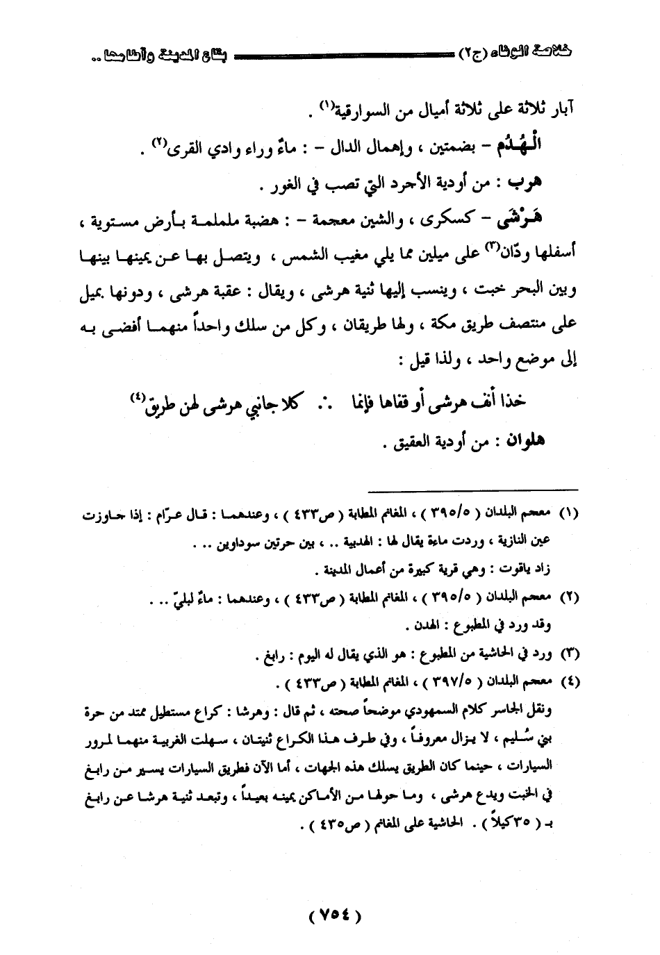 آبار ثلاثة أميال من السوارقية " الهدن " بضمتين وإهمال الدال ماء وراء وادي القرى " هرب " من أودية الأجرد التي تصب في الغور " هرشى " ككسرى والشين معجمة هضبة ململمة بأرض مستوية أسفلها ودان على ميلين مما يلي مغيب الشمس ويتصل بها عن يمينها بينها وبين البحر خبت وينسب إليها ثنية هرشي ويقال عقبة هرشي ودونها بميل علم منتصف طريق مكة ولها طريقان وكل من سلك واحدا منهما أفضى به إلى موضع واحد ولذا قيل: