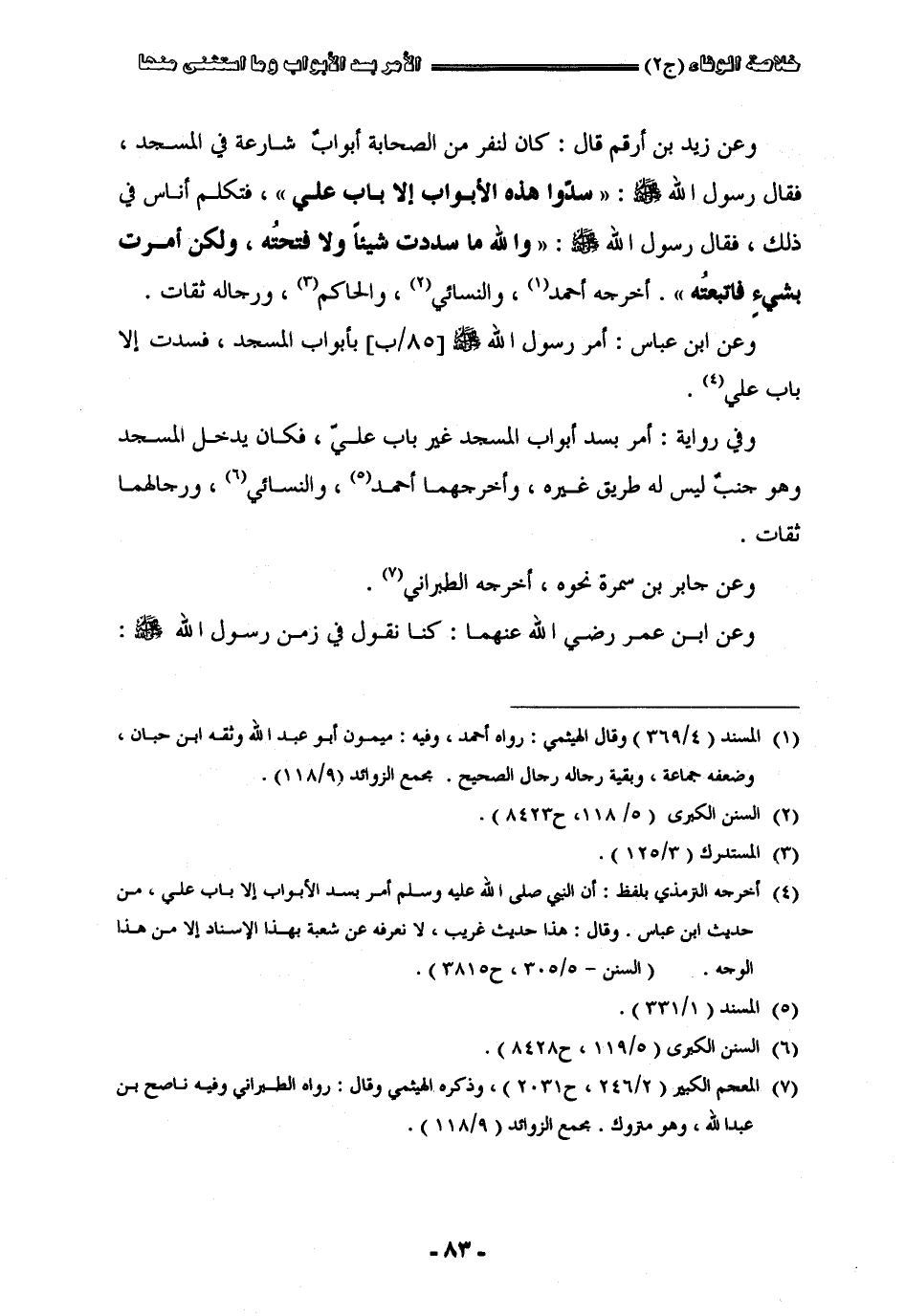وعن زيد بن أرقم قال كان لنفر من الصحابة أبواب شارعة في المسجد فقال رسول الله صلى الله عليه وسلم سدّو هذه الأبواب إلا باب عليّ فتكلم ناس في ذلك فقال رسول الله صلى الله عليه وسلم سددت شيئاً ولا فتحته ولكن أمرت بشيء فأتبعته أخرجه أحمد والنسائي والحاكم ورجاله ثقات وعن ابن