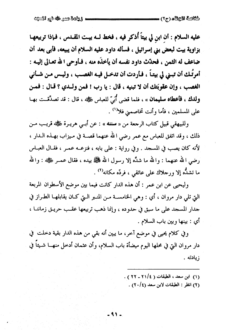 عليه السلام أن أبن لي بيتا أذكر فيه فخط له خطة بيت المقدس فإذا تربيعها بزاوية بيت لبعض بني إسرائيل فسأله داود عليه السلام أن يبيعه فأبى بعد أن ضاعف له الثمن فحدّث داود نفسه أن يأخذه منه فأوحى الله تعالى إليه أمرتك أن تبني لي بيتا فأردت أن تدخل فيه الغضب وليس من شأني الغضب وأن عقوبتك أن لا تبنيه قال يا رب فمن ولدي قال فمن ولدك فأعطاه سليمان فلما قضى أبي للعباس رضي الله عنه قال قد تصدقت بها على المسلمين فأما وأنت تخاصمني فلا وللبيهقي كتاب الرجعة من سننه عن أبي هريرة رضي الله عنه قريب من ذلك وقد أتفق للعباس مع عمر رضي الله عنه قصة في ميزاب بهذه الدار لأنه كان يصب في المسجد وفي رواية على بابه فنزعه عمر فقال العباس رضي الله عنه والله ما شدّه إلا رسول الله صلى الله عليه وسلم فقال عمر رضي الله عنه والله ما تشدّه إلا ورجلاك على عاتقي فردّه مكانه وليحيي عن ابن عمر أن هذه الدار كانت فيما بين موضع الأسطوانة المربعة التي تلي دار مروان وأن أي وهي الخامسة من المنبر التي كان يقابلها الطراز في جدار المسجد على ما سبق في حدوده وإنما ذهب تربيعها عقب حريق زماننا أي بينها وبين باب السلام وفي كلام يحيي في موضع آخر ما بين أنه بقى من هذه الدار بقية دخلت في دار مروان التي في محلها اليوم ميضأة باب السلام وأن عثمان أدخل منها سيأتي في زيادته