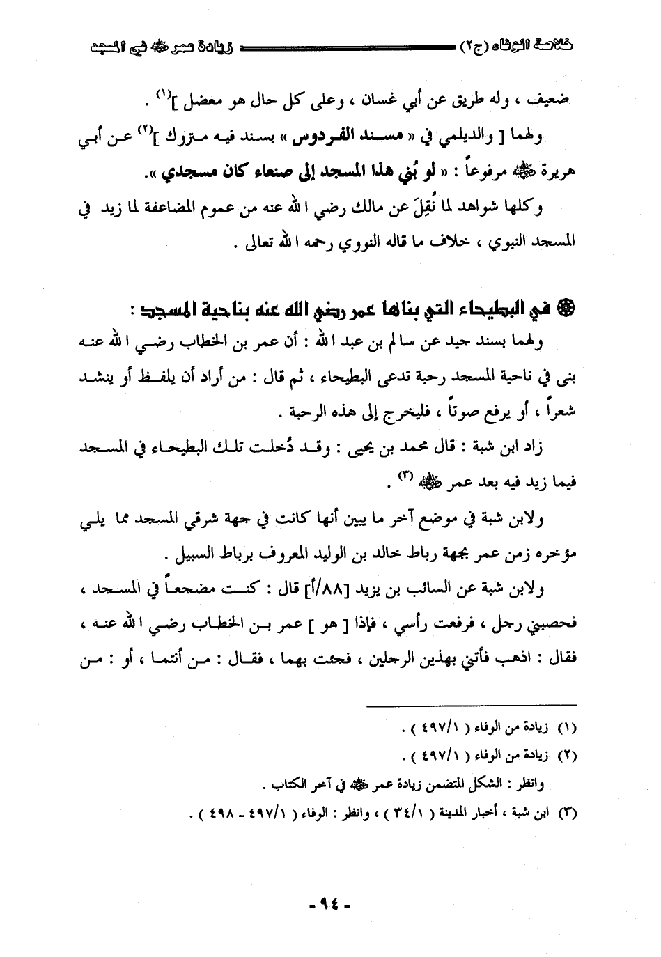 ولهما عن أبي هريرة رضي الله عنه مرفوعا لو بني هذا المسجد إلى صنعاء كان مسجدي وكلها شواهد لما نقل عن مالك رضي الله عنه من عموم المضاعفة لما زيد في المسجد النبوي خلاف ما قاله النووي رحمه الله تعالى ولهما بسند جيد عن سالم بن عبد الله أن عمر ابن الخطاب رضي الله عنه بنى في ناحية المسجد رحبة تدعى البطيحاء ثم قال من أراد أن يلفظ أو ينشد شعرا أو يرفع صوتا فليخرج إلى هذه الرحبة زاد ابن شبة قال محمد بن يحيي وقد دخلت تلك البطيحاء في المسجد فيما زيد فيه بعد عمر رضي الله عنه ولأبن شبة في موضع آخر ما بين أنها كانت في جهة شرقي المسجد مما يلي مؤخره زمن عمر بجهة رباط خالد بن الوليد المعروف برباط السبيل ولأبن شبة عن السائب بن يزيد قال كنت مضطجعا في المسجد فحصبني رجل فعرفت رأسي فإذا هو عمر بن الخطاب رضي الله عنه فقال أذهب فأتى بهذين الرجلين فجئت بهما فقال من أنتما أو من