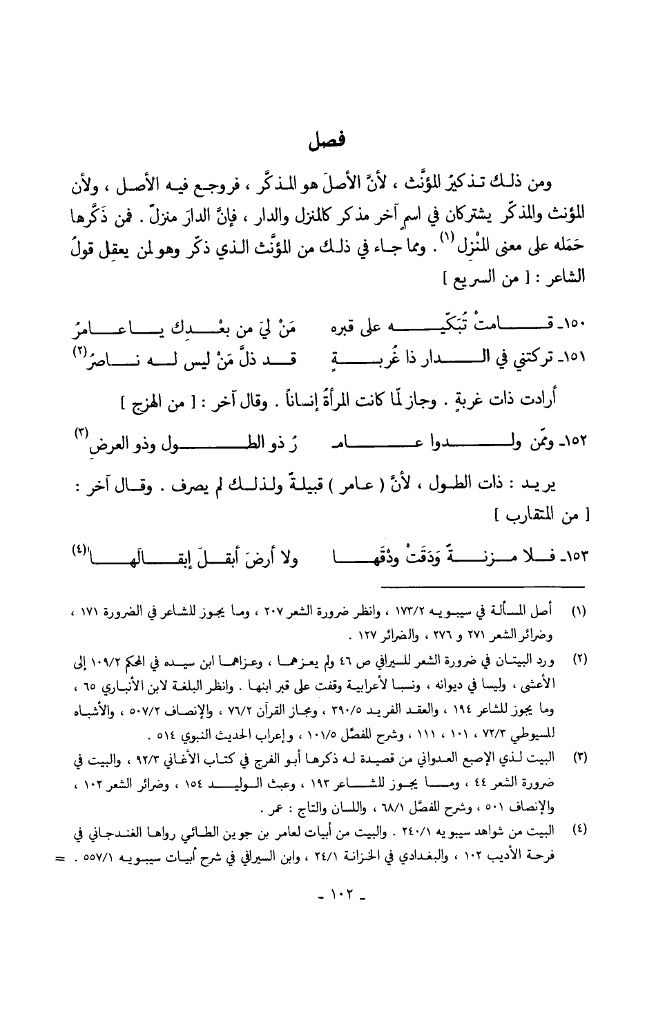 وَمن ذَلِك تذكيرُ المؤنَّث لأنَّ الأصلَ هُوَ المذكَّر فروج فِيهِ الأَصْل وَلِأَن الْمُؤَنَّث والمذكّر يَشْتَرِكَانِ فِي اسمٍ آخر مُذَكّر كالمنزل وَالدَّار فإنَّ الدارَ منزلٌ فَمن ذَكَّرها حَمَله على معنى المنْزِل وَمِمَّا جَاءَ فِي ذَلِك من المؤنَّث الَّذِي ذكّر وَهُوَ لمن يعقِل قولُ الشَّاعِر من // السَّرِيع //