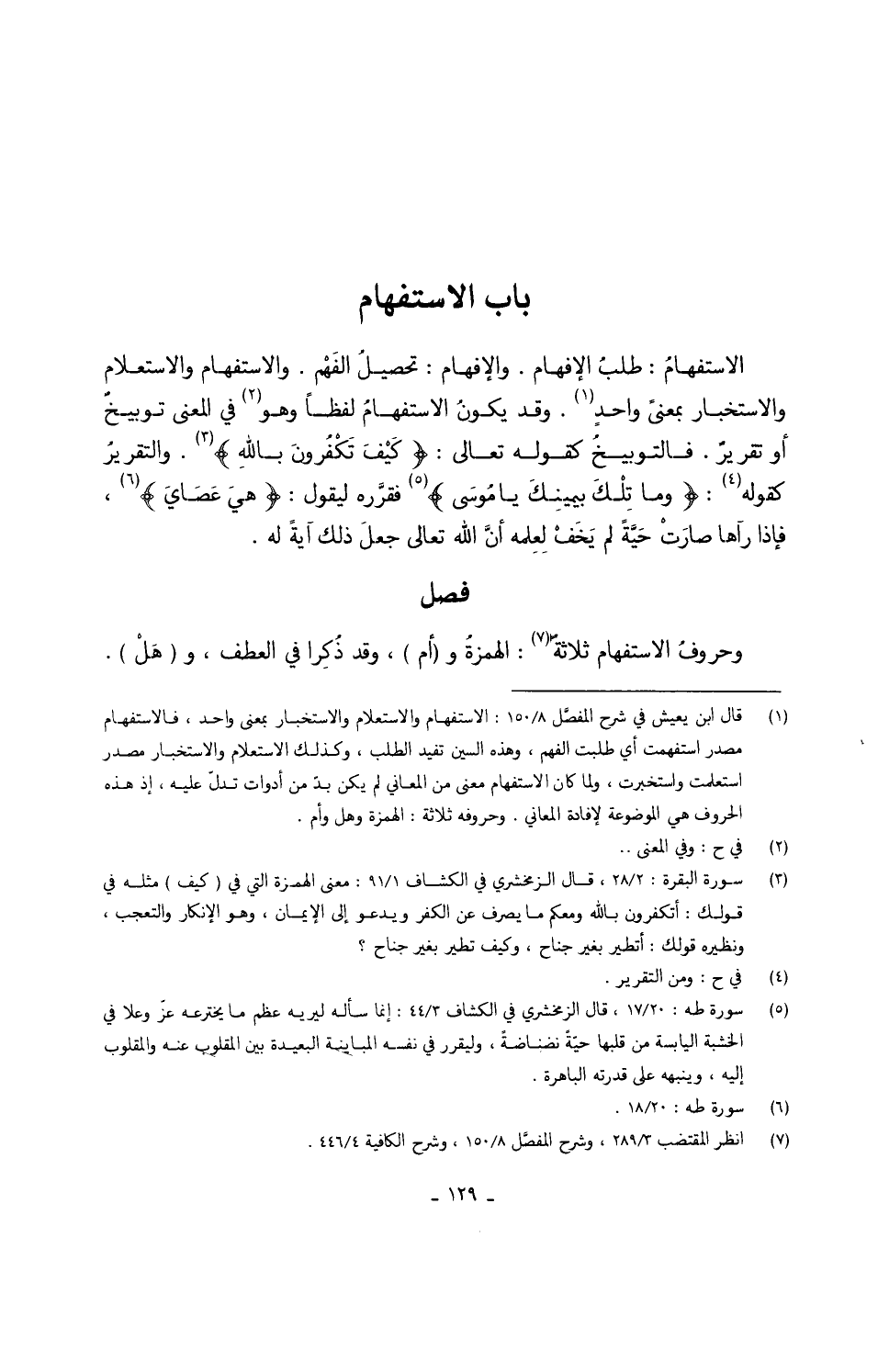 الاستفهامُ طلبُ الإفهام والإفهام تحصيلُ الفَهْم والاستفهام والاستعلام والاستخبار بِمَعْنى واحدٍ وَقد يكونُ الاستفهامُ لفظا وَهُوَ فِي الْمَعْنى توبيخٌ أَو تقريرٌ فالتوبيخُ كَقَوْلِه تَعَالَى {كَيْفَ تَكْفُرونَ باللهِ} والتقريرُ كَقَوْلِه {وَمَا تِلْكَ بيمينكَ يَا مُوسَى} فقرَّره ليقول {هيَ عَصَايَ} فَإِذا رَآهَا صارَتْ حَيَّةً لم يَخَفْ لِعِلمه أنَّ الله تَعَالَى جعلَ ذَلِك آيَة لَهُ