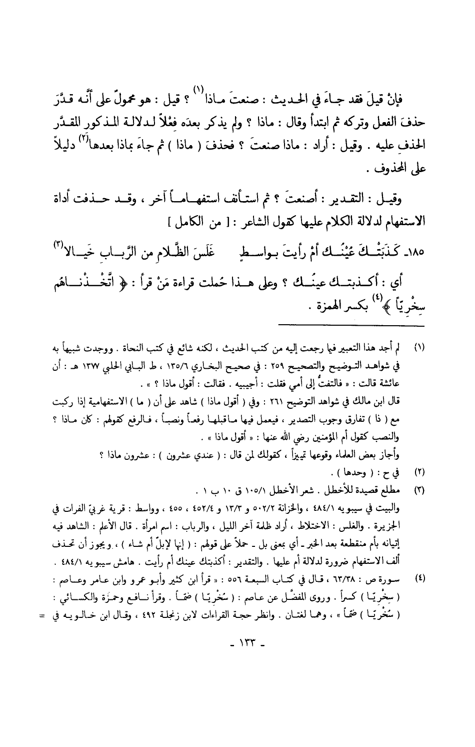 وَقيل التَّقْدِير أصنعتَ ثمَّ اسْتَأْنف استفهاماً آخر وَقد حذفت أَدَاة الِاسْتِفْهَام لدلَالَة الْكَلَام عَلَيْهَا كَقَوْل الشَّاعِر من // الْكَامِل //