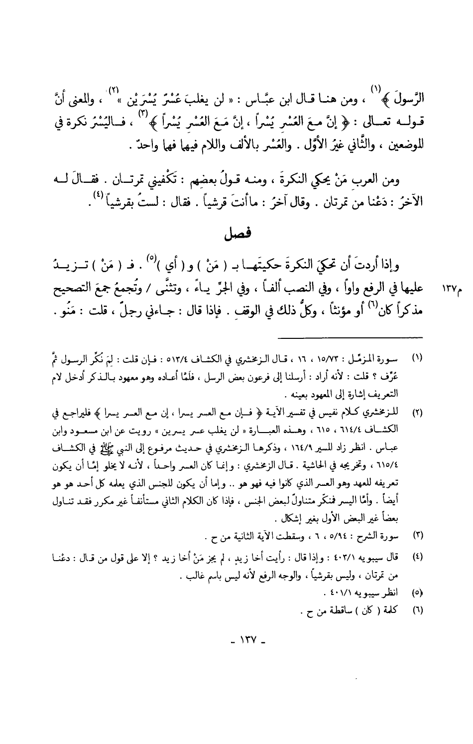 الرَّسُول وَمن هُنَا قَالَ ابْن عبَّاس لن يغلبَ عسر يسرين وَالْمعْنَى أَن قَوْله تَعَالَى {فَإِن مَعَ العُسْرِ يُسْراً إنَّ مَعَ الْعسر يسْرا} فاليُسْر نكرَة فِي الْمَوْضِعَيْنِ وَالثَّانِي غيرُ الأوَّل والعسْر بِالْألف وَاللَّام فيهمَا فهما واحدٌ