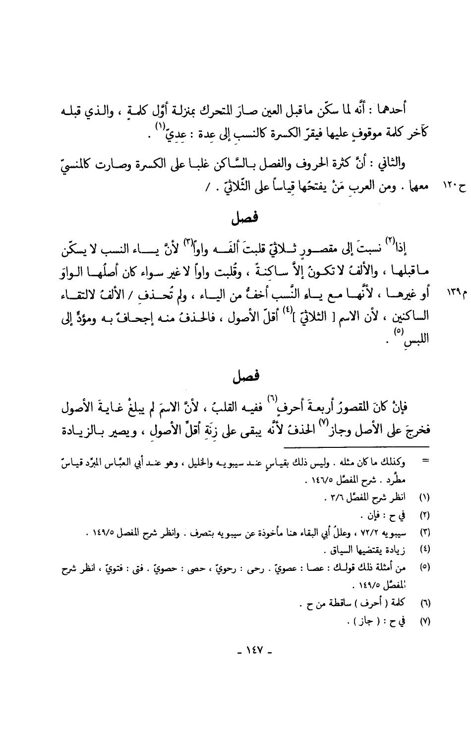 إِذا نسيتَ إِلَى مقصورٍ ثلاثيّ قلبتَ ألفَه واواً لأنَّ يَاء النّسَب لَا يسكّن مَا قبلهَا والألفُ لَا تكونُ إلاَّ ساكِنةً وقُلبت واواً لَا غير سَوَاء كَانَ أصلُها الواوَ أَو غَيرهَا لأنَّها مَعَ ياءِ النَّسب أخفُّ من الْيَاء وَلم تُحذفِ الالفُ لالتقاء الساكنين لِأَن الِاسْم الثلاثيّ أقلَ الْأُصُول فالحذفُ مِنْهُ إجحافٌ بِهِ ومؤدٍّ إِلَى اللّبْس