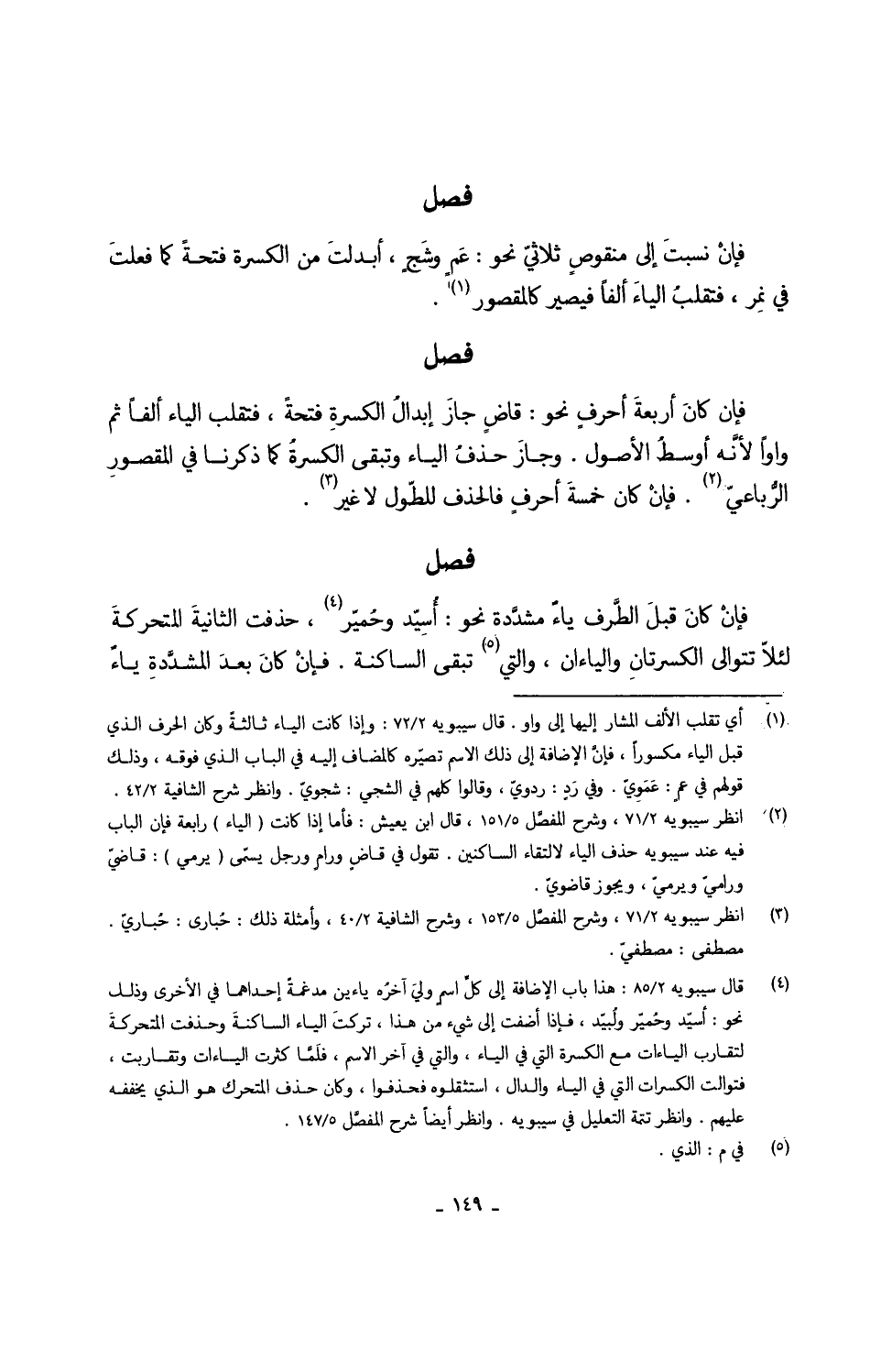 فَإِن كانَ أربعةَ أحرفٍ نَحْو قاضٍ جازَ إبدالُ الكسرة فَتْحة فتقلب الْيَاء الْفَا ثمَّ واواً لأنَّه أوسطُ الْأُصُول وجازَ حذفُ الْيَاء وَتبقى الكسرةُ كَمَا ذكرنَا فِي المقصورِ الرُّباعيّ فإنْ كَانَ خمسةَ أحرفٍ فالحذف للطّول لَا غير
